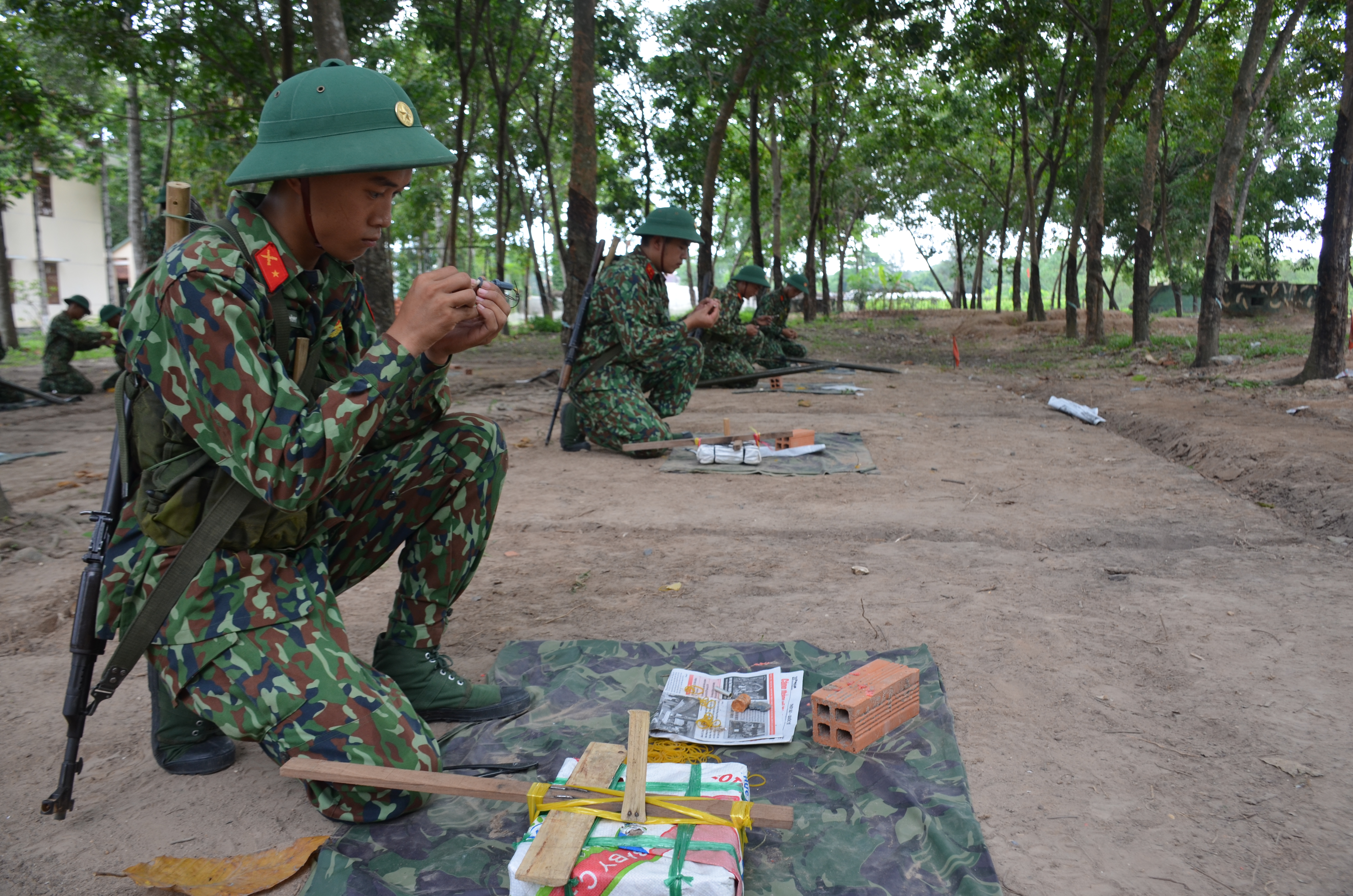 Chiến sĩ mới Phạm Minh Hy, Đại đội 1, Tiểu đoàn 10 đang thực hiện thao tác tra lắp đồ dùng gây nổ. Chỉ trong thời gian ngắn, Hy đã lắp đầy đủ một bộ đồ dùng gây nổ gồm kíp nổ, nụ xòe, dây cháy chậm và bánh thuốc nổ.