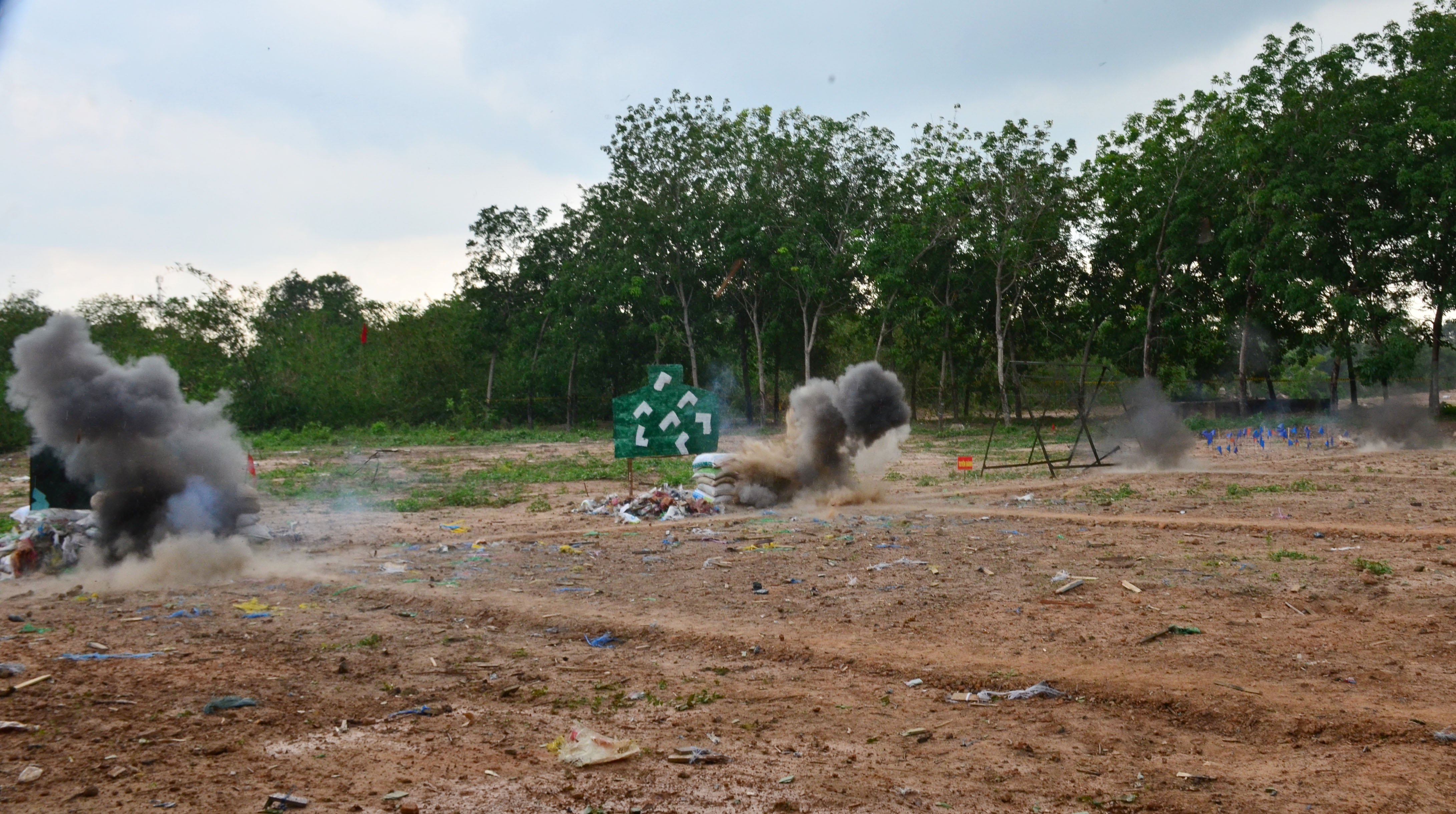 Tại khu vực ném lựu đạn, chiến sĩ nào cũng phấn chấn chờ đợi giây phút được vào tuyến ném, gương mặt lộ rõ sự tự tin. Khẩu lệnh của chỉ huy: “Chuẩn bị…! Ném…!” vừa dứt, các chiến sĩ bình tĩnh giật chốt và ném lựu đạn về phía mục tiêu. Vài giây sau, một tiếng nổ vang lên, chớp lửa lóe sáng, bụi đất tung lên tơi tả. Ngay sau đó, tiếng chỉ huy báo “Giỏi!” vang lên.