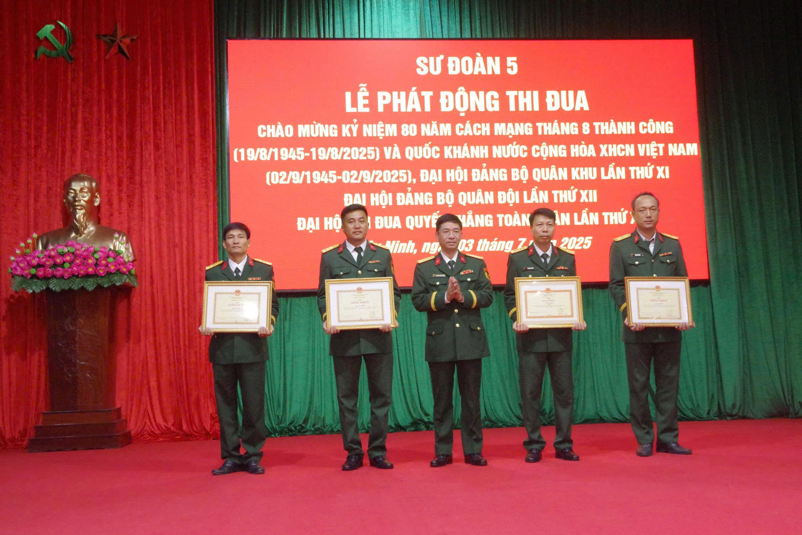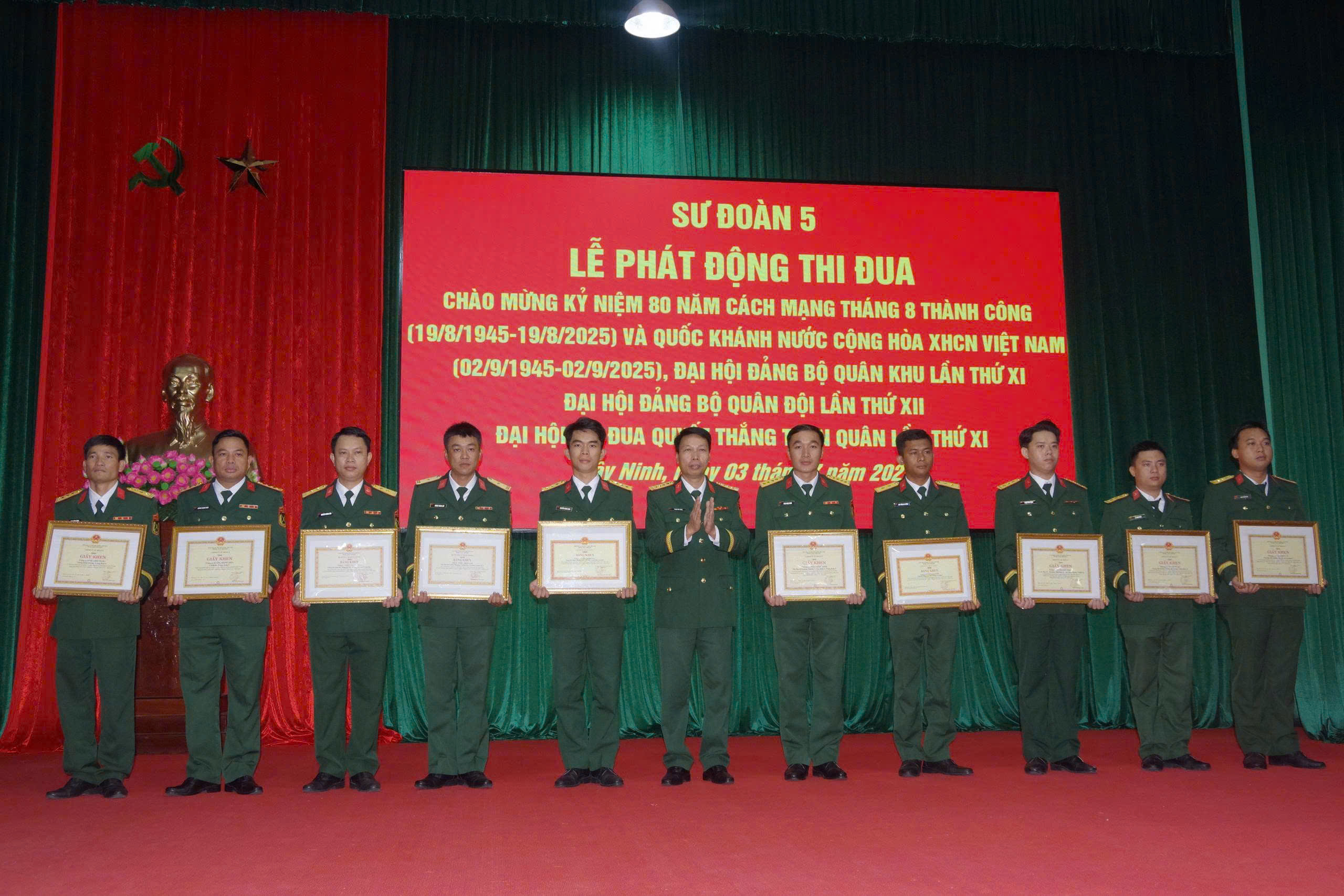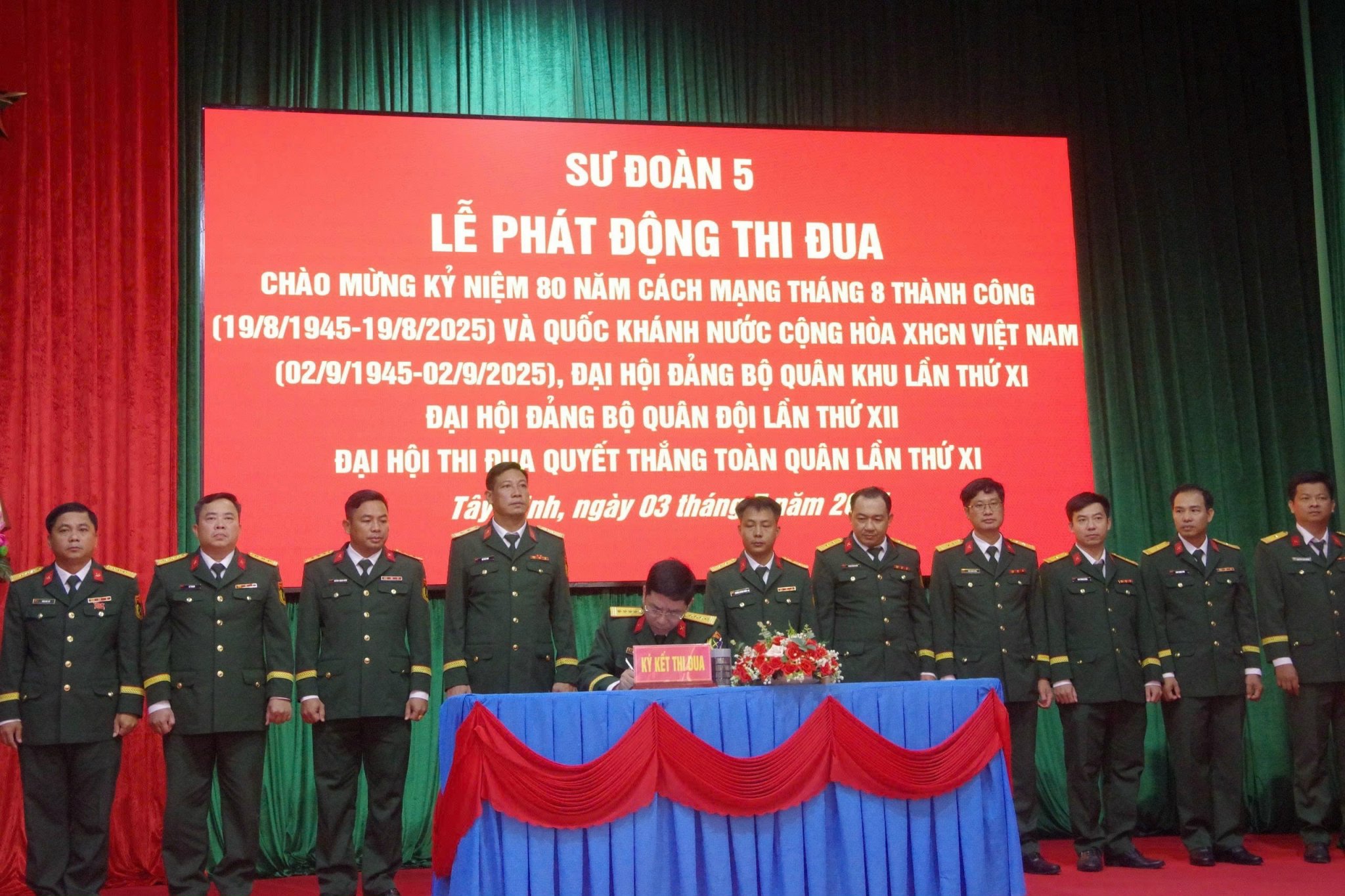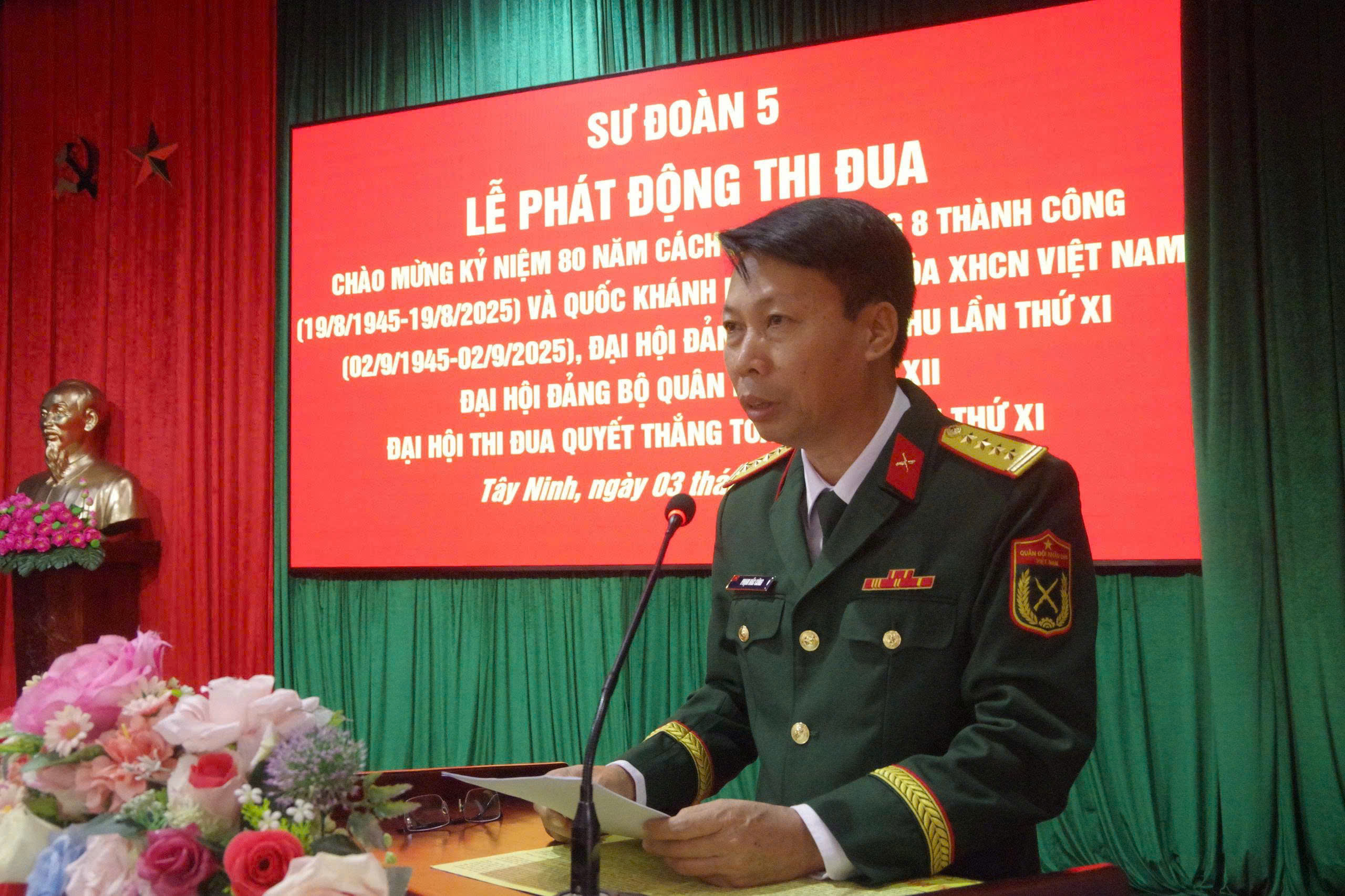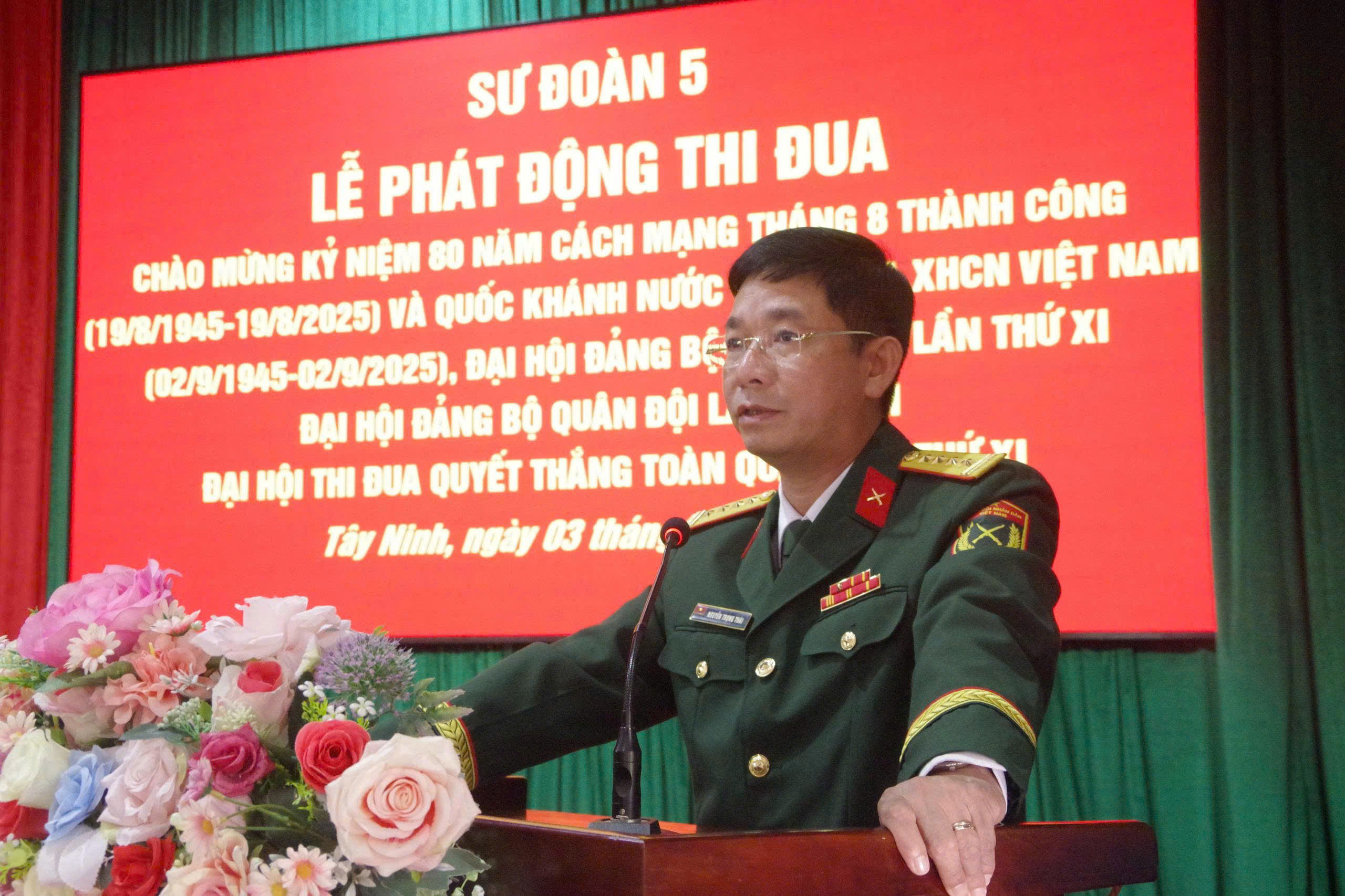 (QK7 Online) -Sáng 3/7, Sư đoàn 5tổ chức Lễ phát động đợt thi đua cao điểm “Phất cao cờ hồng tháng Tám - Thi đua giành 3 nhất” chào mừng kỷ niệm 80 năm Cách mạng Tháng Tám thành công (19/8/1945 - 19/8/2025) và Quốc khánh nước Cộng hòa XHCN Việt Nam (2/9/1945 - 2/9/2025), Đại hội Đại biểu Đảng bộ Quân khu 7 lần thứ XI, Đại hội Đảng bộ Quân đội lần thứ XIII, Đại hội Thi đua Quyết thắng toàn quân lần thứ XI.Đại tá Nguyễn Trọng Thái, Phó Sư đoàn trưởng dự và chỉ đạo. Đại tá Phạm Đắc Công, Chủ nhiệm Chính trị Sư đoàn chủ trì buổi lễ.