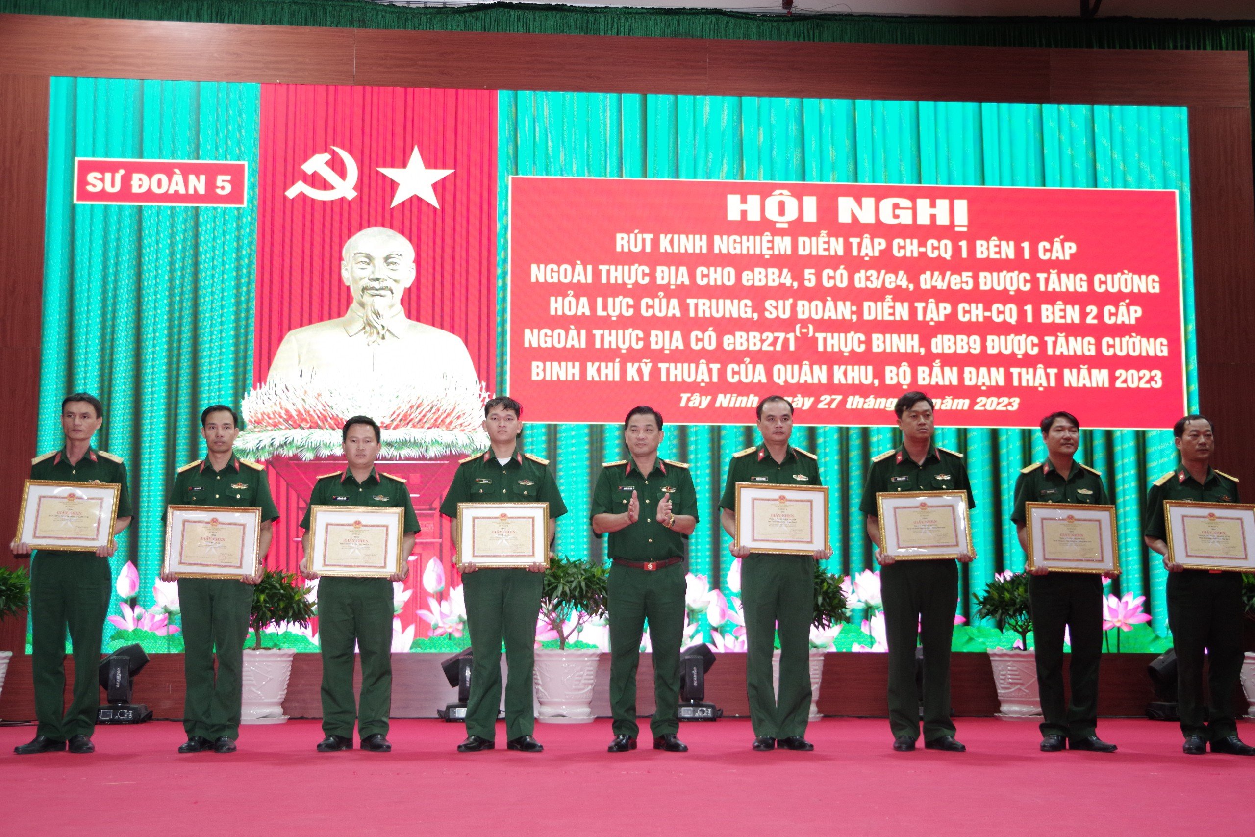 Tại hội nghị, Sư đoàn 5 khen thưởng 6 tập thể và 6 cá nhân đã hoàn thành tốt nhiệm vụ diễn tập năm 2023.