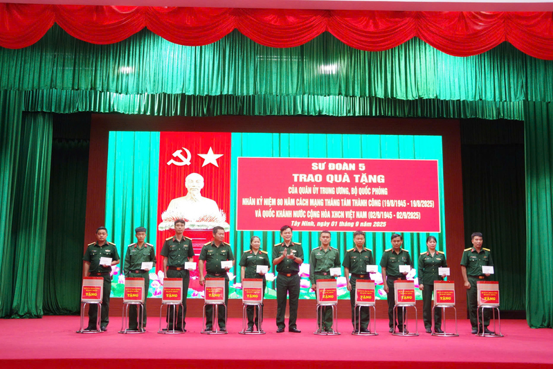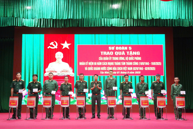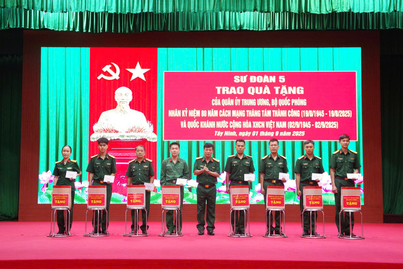 (QK7 Online) - Ngày 1/9, Sư đoàn 5 tổ chức trao tặng quà của Quân ủy Trung ương, Bộ Quốc phòng cho cán bộ, chiến sĩ có hoàn cảnh đặc biệt khó khăn nhân kỷ niệm 80 năm Cách mạng tháng Tám thành công và Quốc khánh 2/9. Đại tá Trần Hoàng Giang, Chính ủy Sư đoàn đến dự.