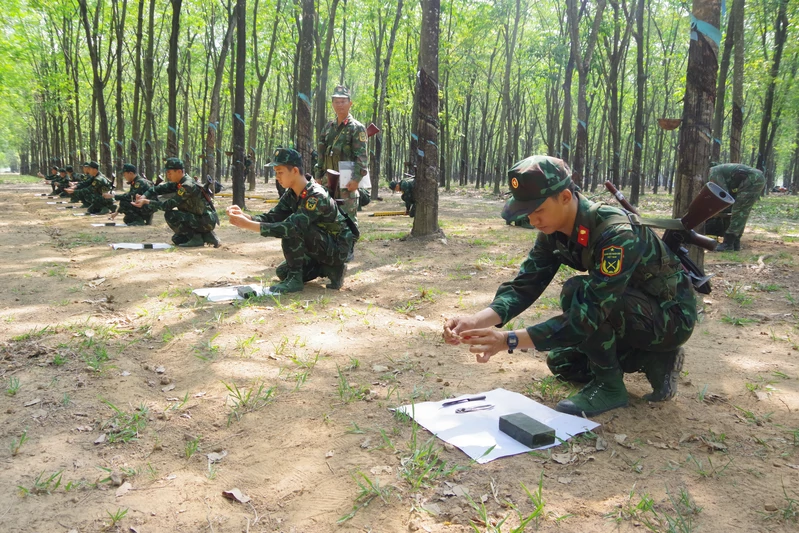 Tại đây, chiến sĩ mới đã chuẩn bị đầy đủ các vật chất cần thiết như thanh gỗ kê, dao cắt, dây cháy chậm, nụ xùy, kíp nổ tập, nghiêm túc ở tư thế sẵn sàng chiến đấu. Khi có tín hiệu bắt đầu, chiến sĩ cẩn thận dùng tay trái kẹp đỡ kíp nổ, tay phải kẹp dây cháy chậm, hai cổ tay áp sát nhau, lắp dây cháy chậm vào kíp nổ đến điểm đánh dấu, sau đó kẹp cố định cách miệng kíp nổ 2mm và dùng xà phòng bôi kín khoảng tiếp giáp. Quá trình thực hiện, từng người luôn giữ trạng thái tập trung cao nhất, động tác tỉ mỉ, bảo đảm nguyên tắc an toàn.