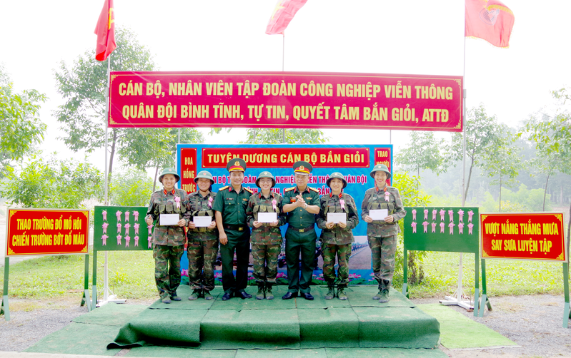 Đại tá Trịnh Lưu Bình, Phó Sư đoàn trưởng, Tham mưu trưởng Sư đoàn 7 (thứ 3 bên phải) tặng hoa bắn giỏi cho quân nhân dự bị.