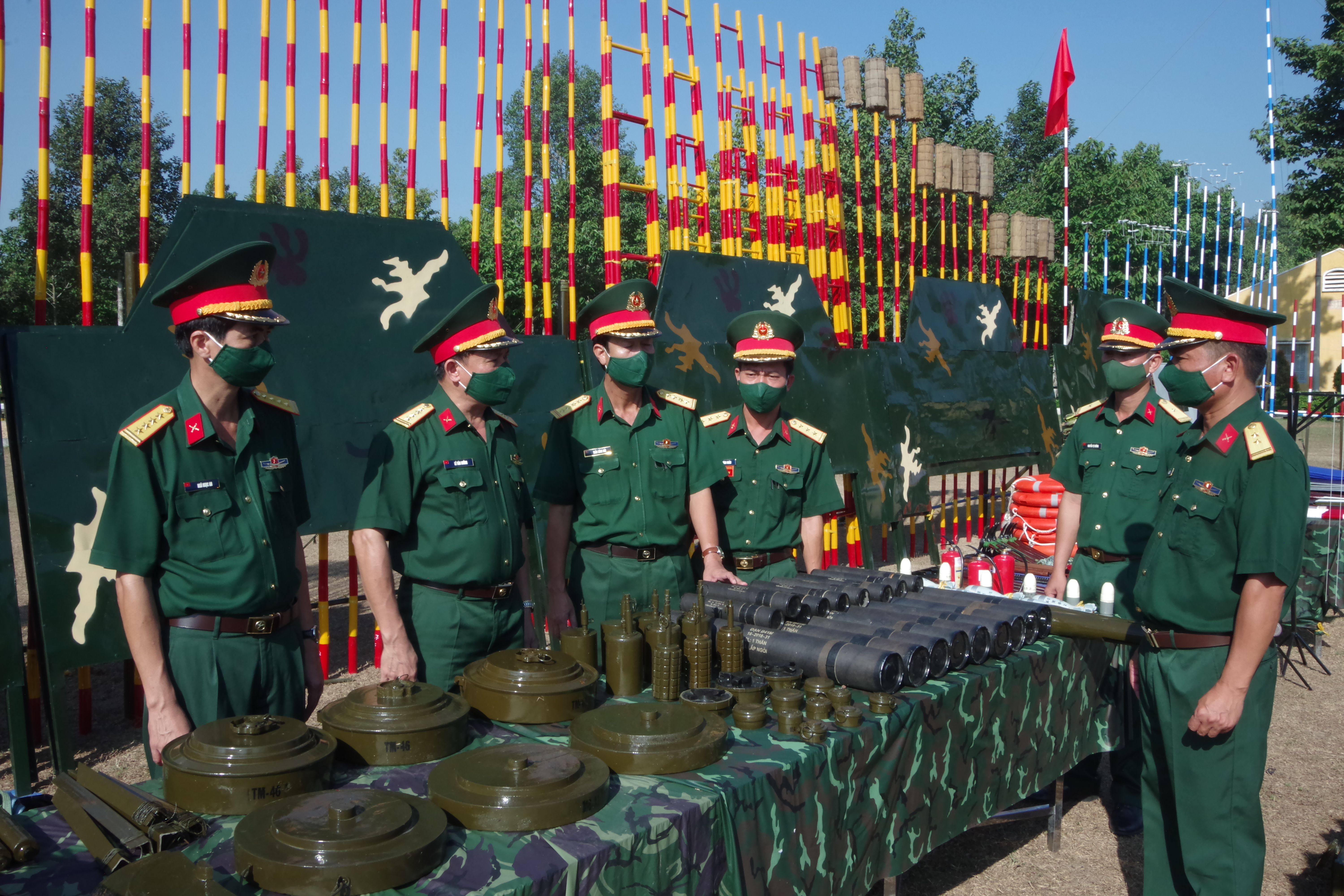 Đại tá Lê Văn Hướng (thứ 2 từ bên trái) kiểm tra mô hình học cụ huấn luyện.