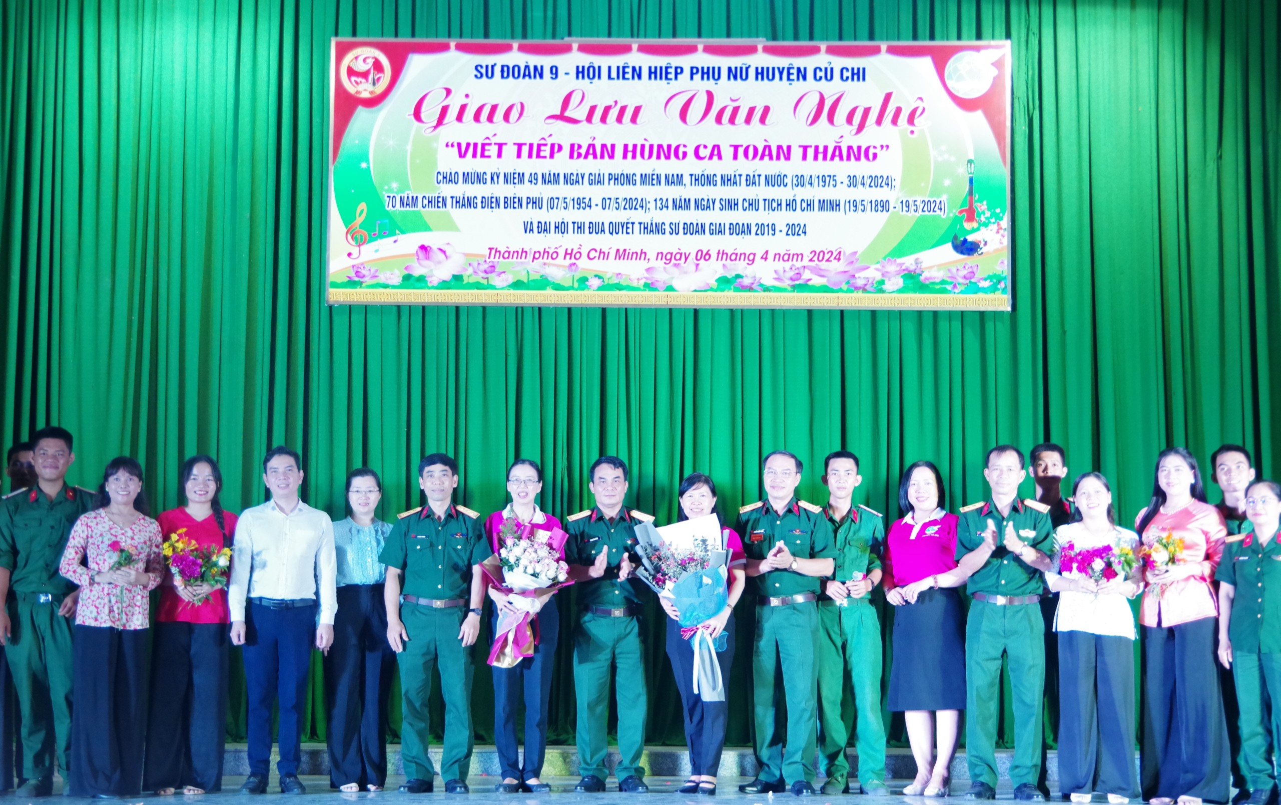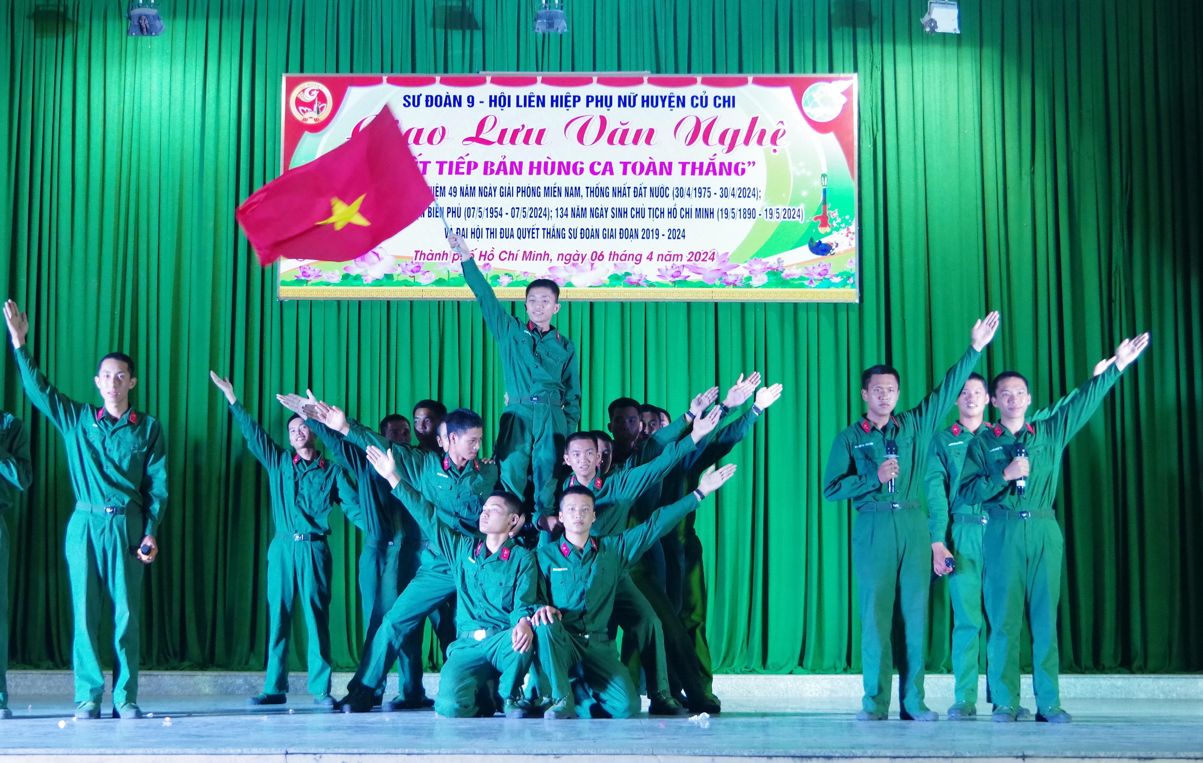 (QK7 Online) - Tối ngày 6/4, Sư đoàn 9 (Quân đoàn 4) phối hợp với Hội Liên hiệp Phụ nữ (LHPN) huyện Củ Chi, TP. Hồ Chí Minh tổ chức giao lưu văn nghệ với chủ đề “Viết tiếp bản hùng ca toàn thắng” chào mừng kỷ niệm 49 năm Ngày giải phóng miền Nam, thống nhất đất nước (30/4/1975 – 30/4/2024); 70 năm Chiến thắng Điện Biên Phủ (7/5/1954 – 7/5/2024); 134 năm Ngày sinh Chủ tịch Hồ Chí Minh (19/5/1890 – 19/5/2024) và Đại hội Thi đua Quyết thắng Sư đoàn 9 giai đoạn 2019 - 2024.