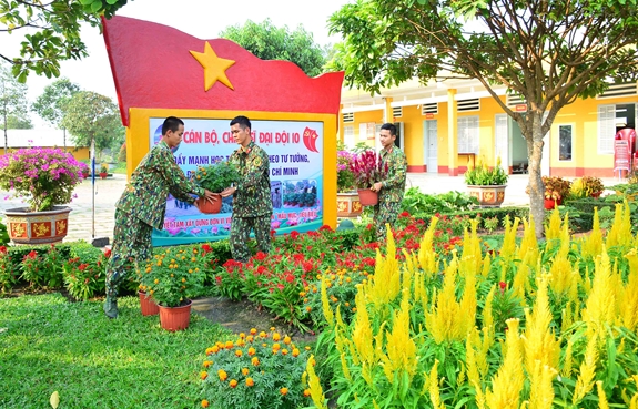 Đặt chân đến Trung đoàn 2, Sư đoàn 9, chúng tôi vô cùng ngạc nhiên với cảnh quan môi trường rực rỡ sắc Xuân. Cán bộ, chiến sĩ cùng nhau trang trí, củng cố doanh trại, chăm chút cho từng bồn hoa, chậu cảnh, trang trí các câu lạc bộ quân nhân, khu vực vui Xuân mang đậm nét văn hóa phương Nam. Những khẩu hiệu, biểu ngữ mừng Đảng, mừng Xuân tạo nên khí thế phấn khởi, rộn ràng, tô thắm sắc Xuân cho đơn vị. Cùng đồng đội vừa hoàn thành sơn mới công trình bản tin thi đua, Binh nhất Nguyễn Minh Thành, Trung đội 6, Đại đội 10, Tiểu đoàn 6, Trung đoàn 2 chia sẻ: “Những ngày qua, tôi và các đồng đội chấp hành nghiêm kế hoạch của đơn vị, trực cao điểm SSCĐ bảo vệ Đại hội lần thứ XIII của Đảng. Cùng với đó, tích cực cùng nhau củng cố, làm đẹp doanh trại, trang khí khu vui Xuân để chuẩn bị đón Tết Tân Sửu vui tươi, ấm áp. Với tinh thần quyết tâm cao nhất, chúng tôi sẽ thi đua hoàn thành tốt mọi nhiệm vụ được giao, góp phần lập công dâng Đảng”.