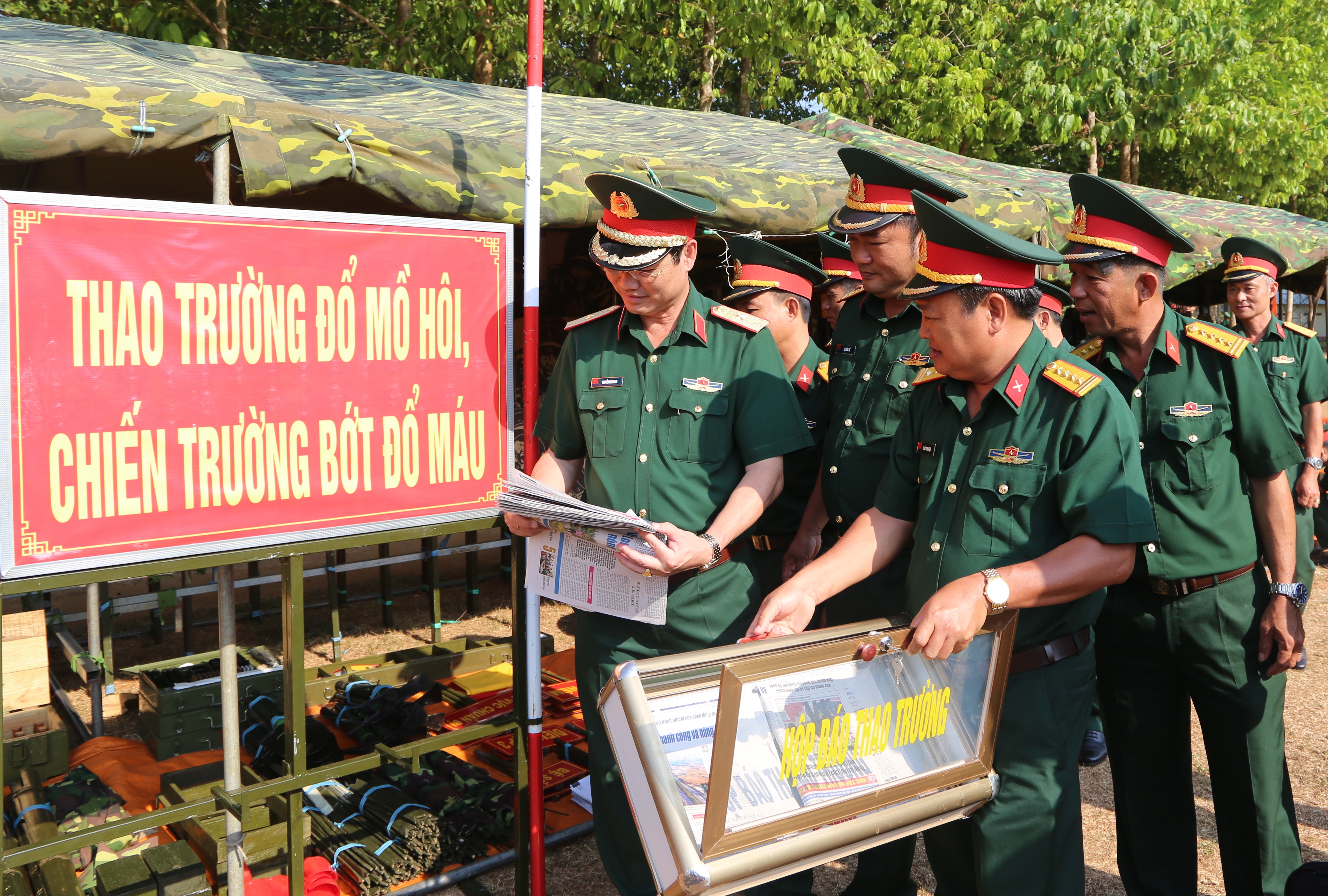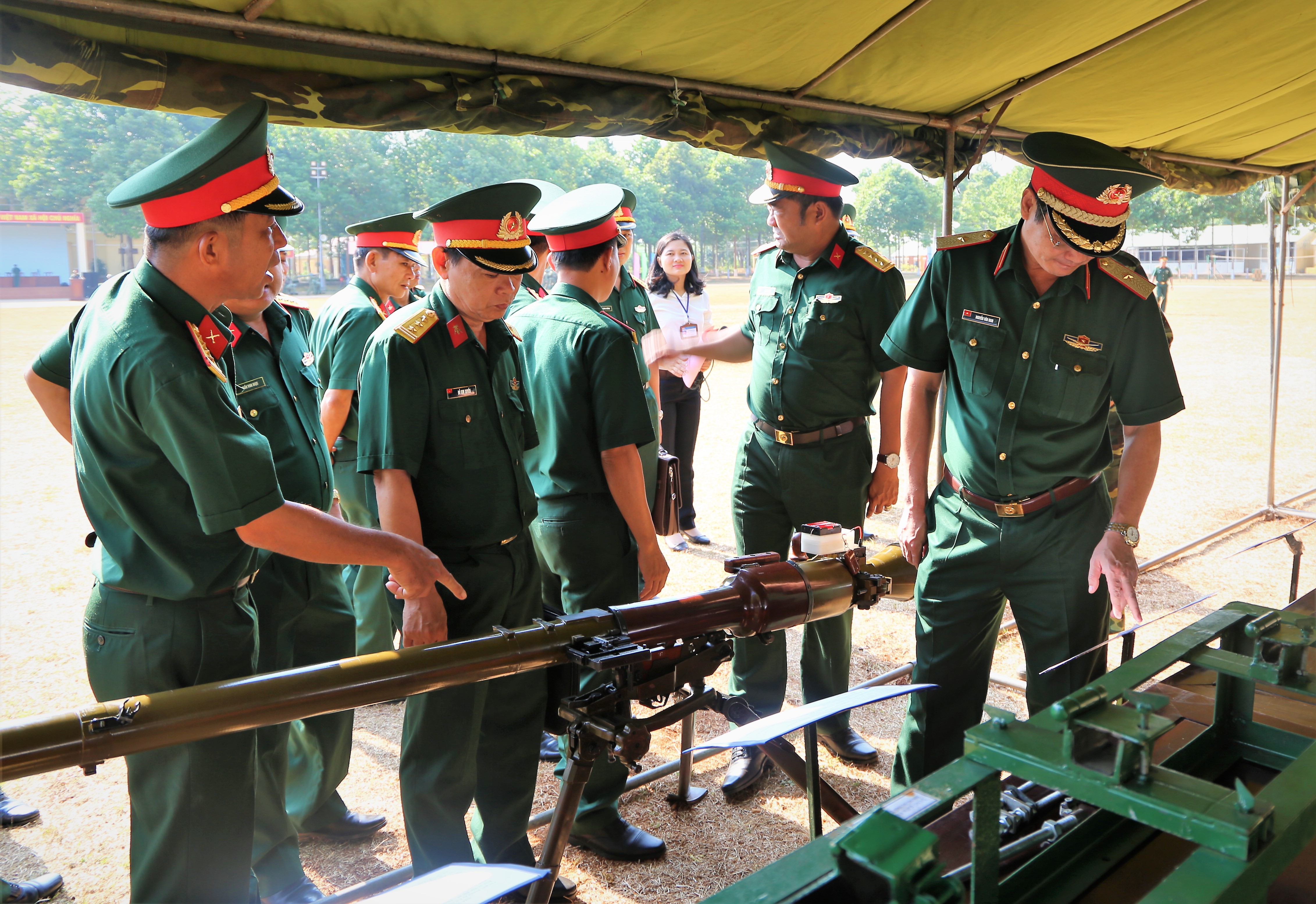Thủ trưởng Quân khu kiểm tra mô hình học cụ sau buổi lễ.