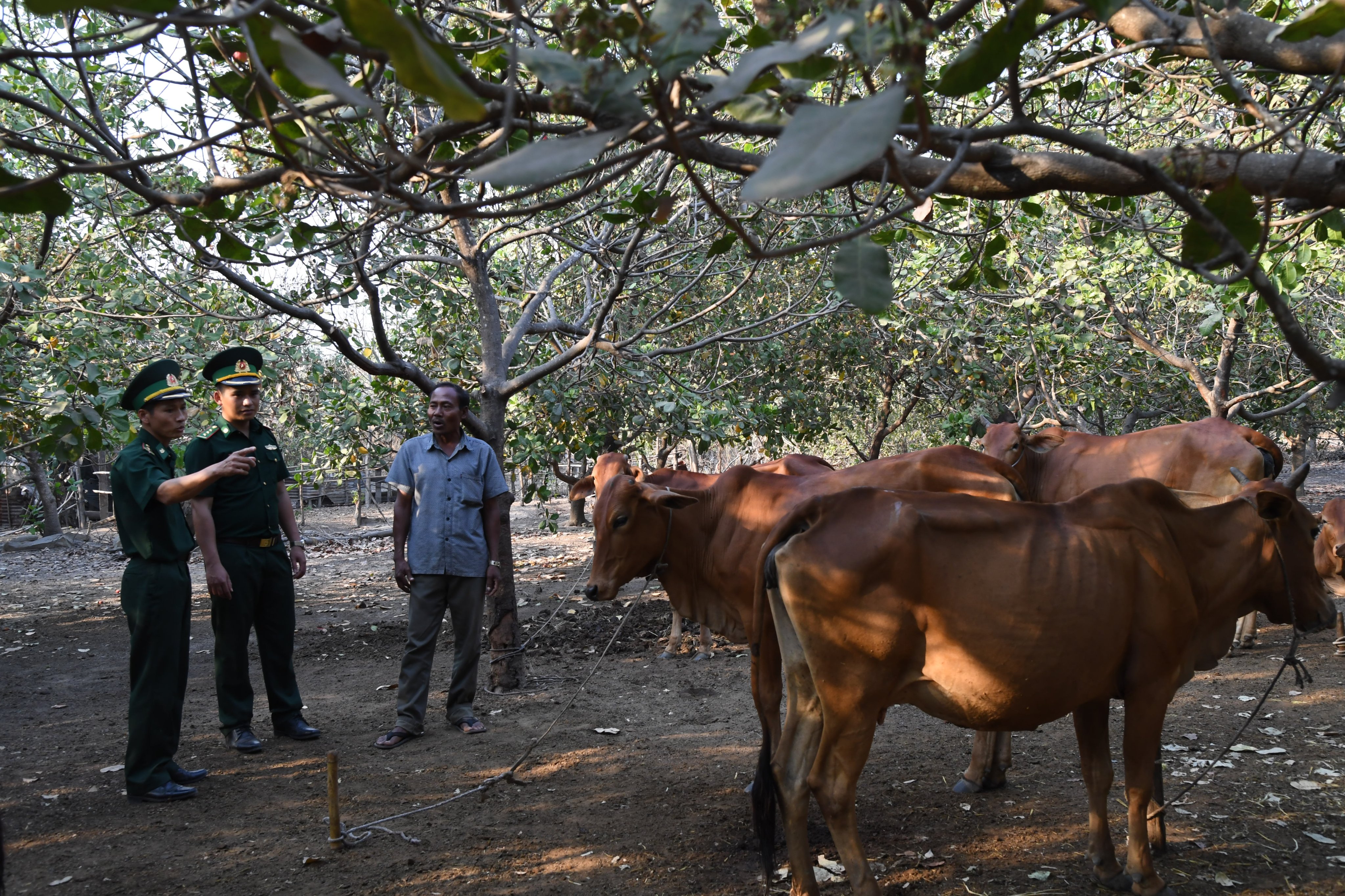 Bộ đội Biên phòng Lộc Ninh phổ biến kinh nghiệm nuôi bò cho bà con ấp Tà Thiết.