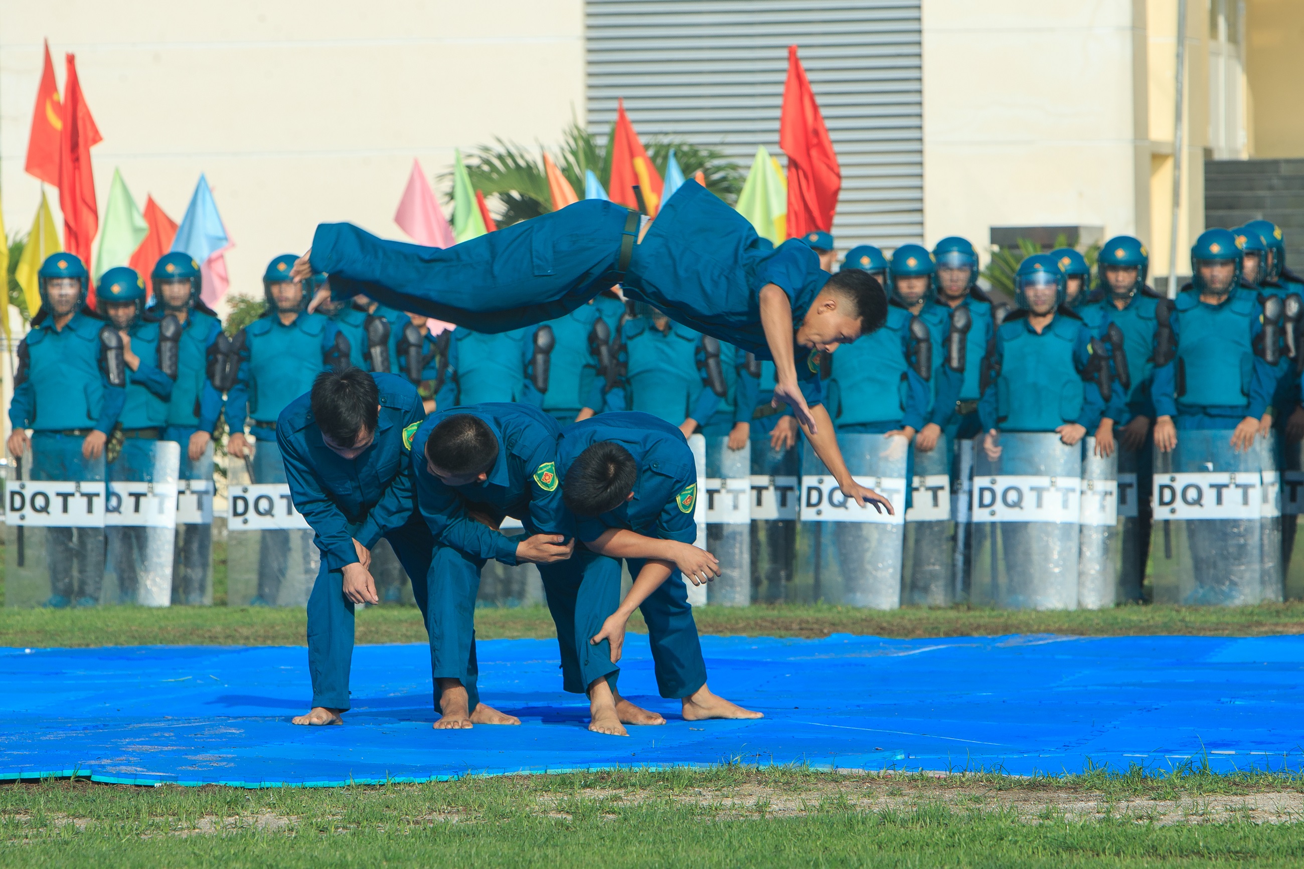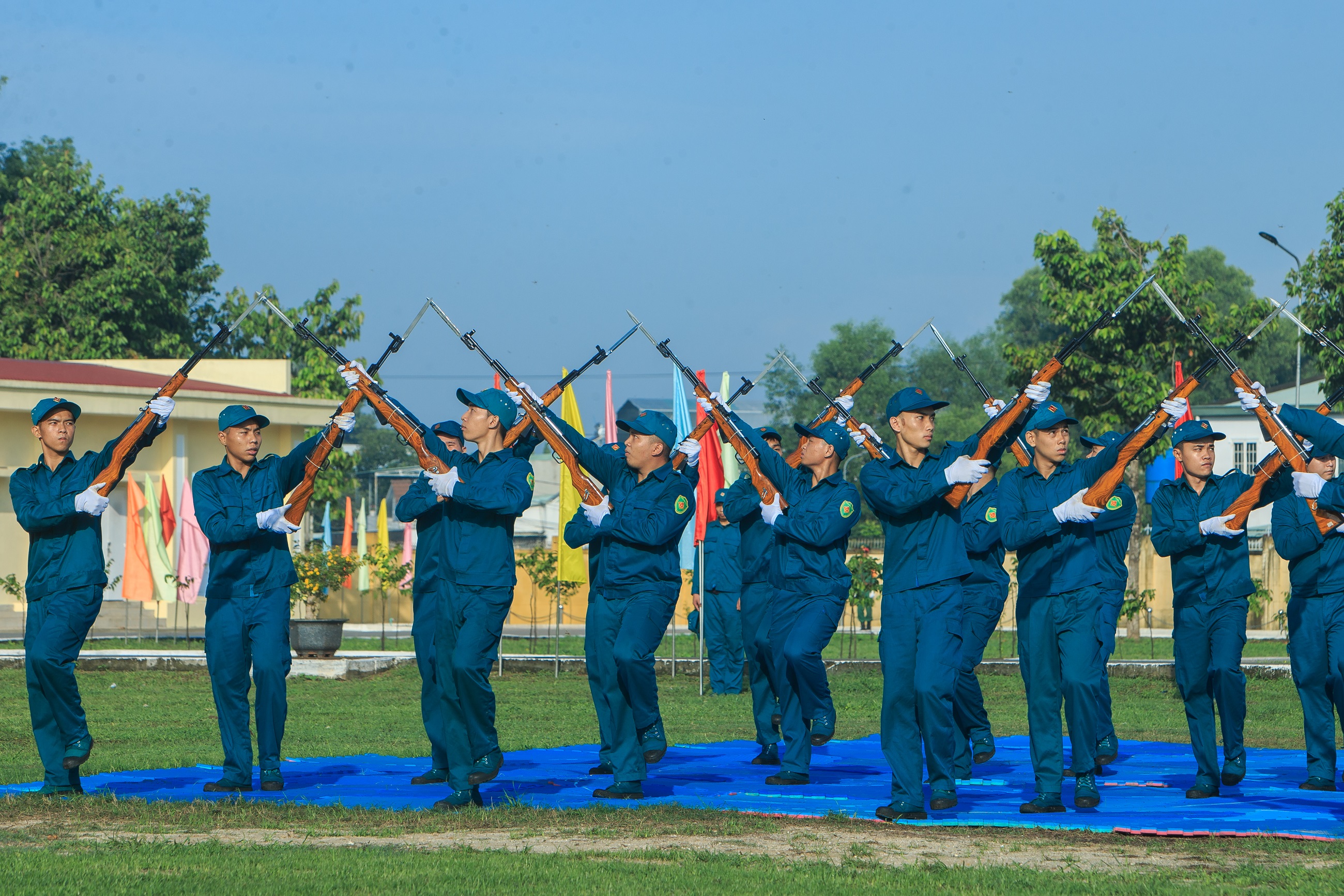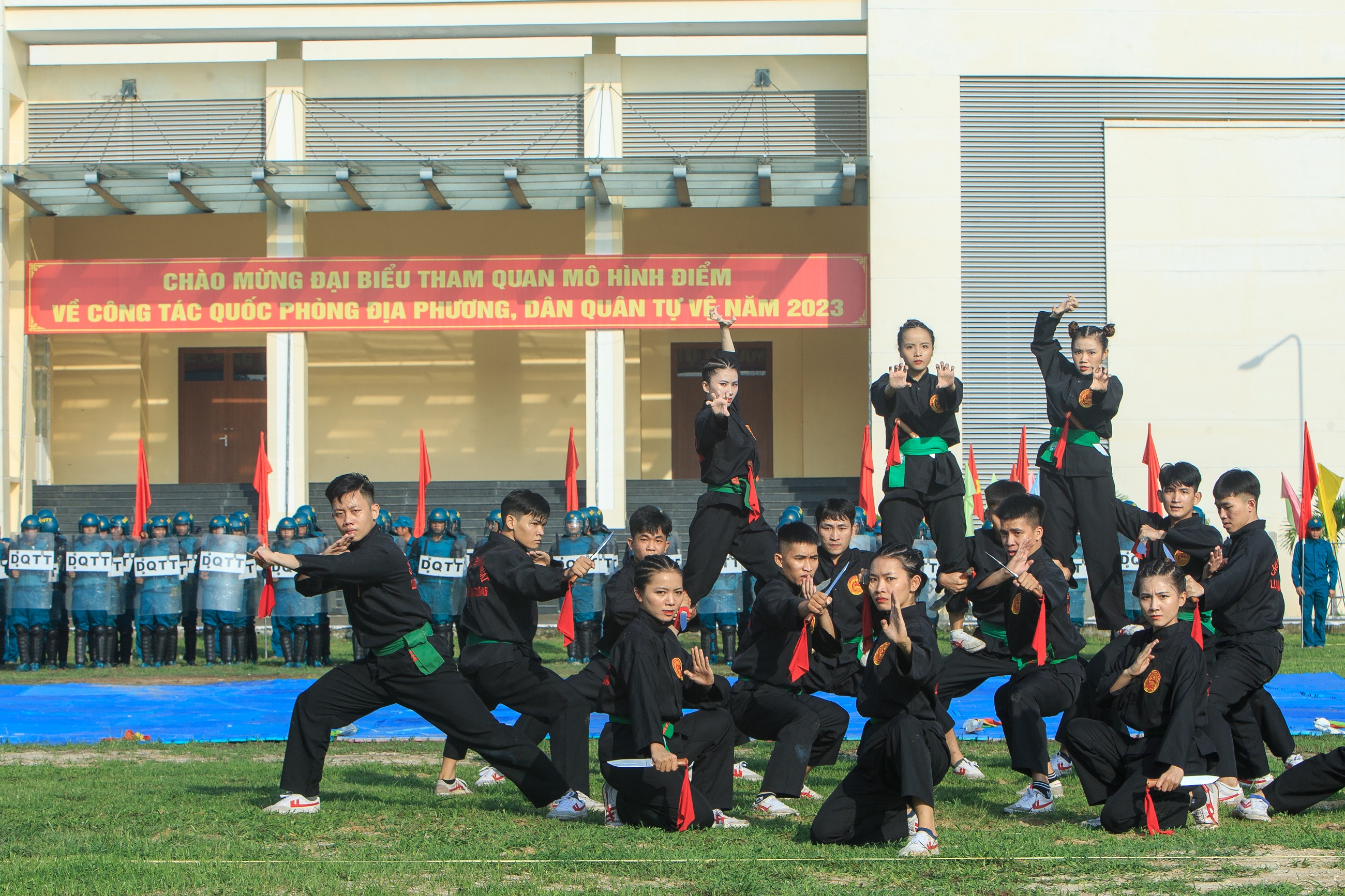 Dân quân biểu diễn các nội dung võ thuật chào mừng đại biểu.