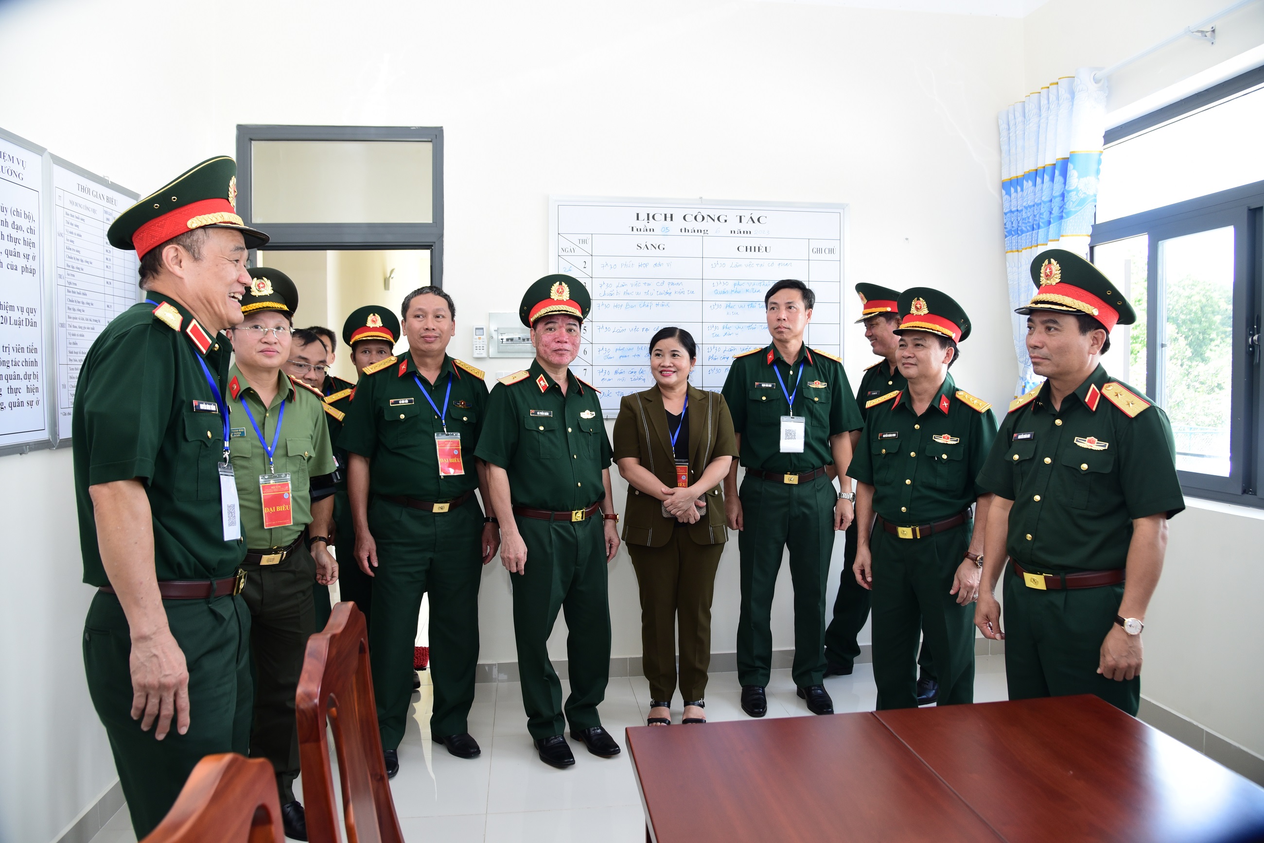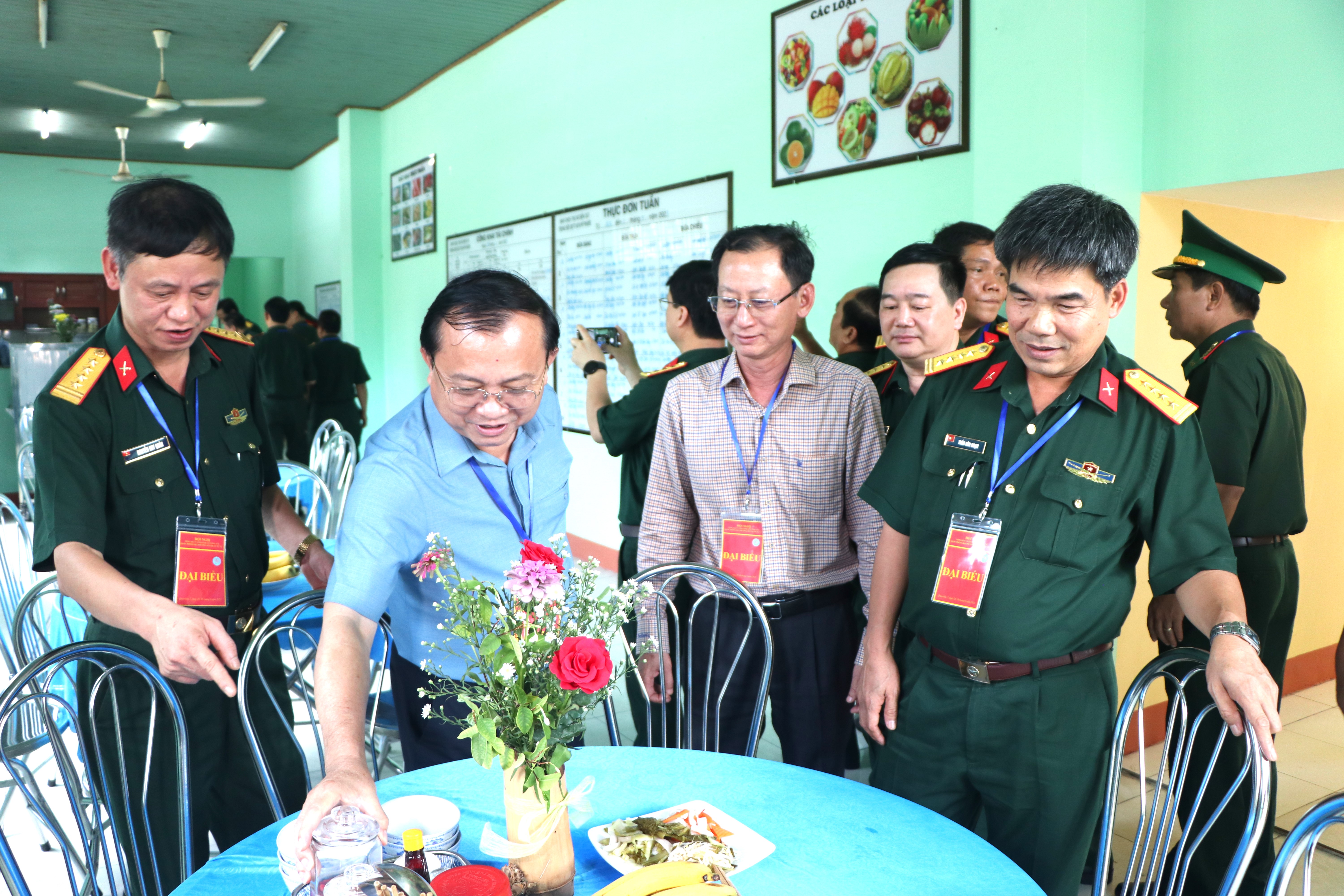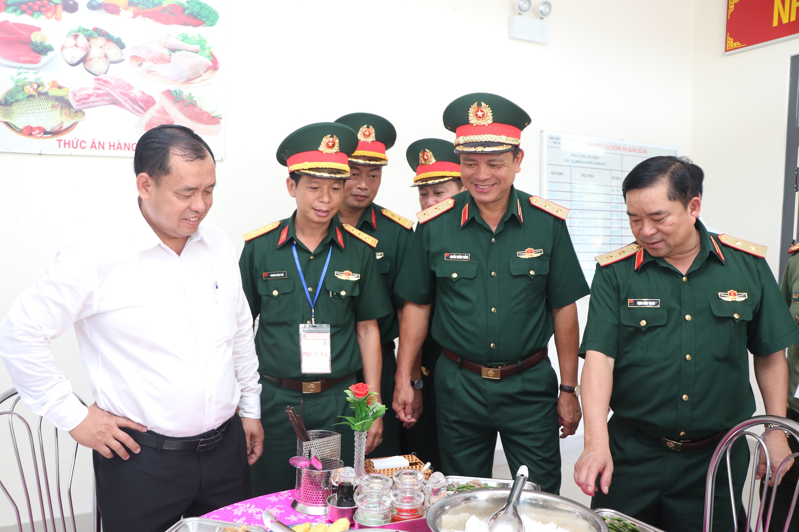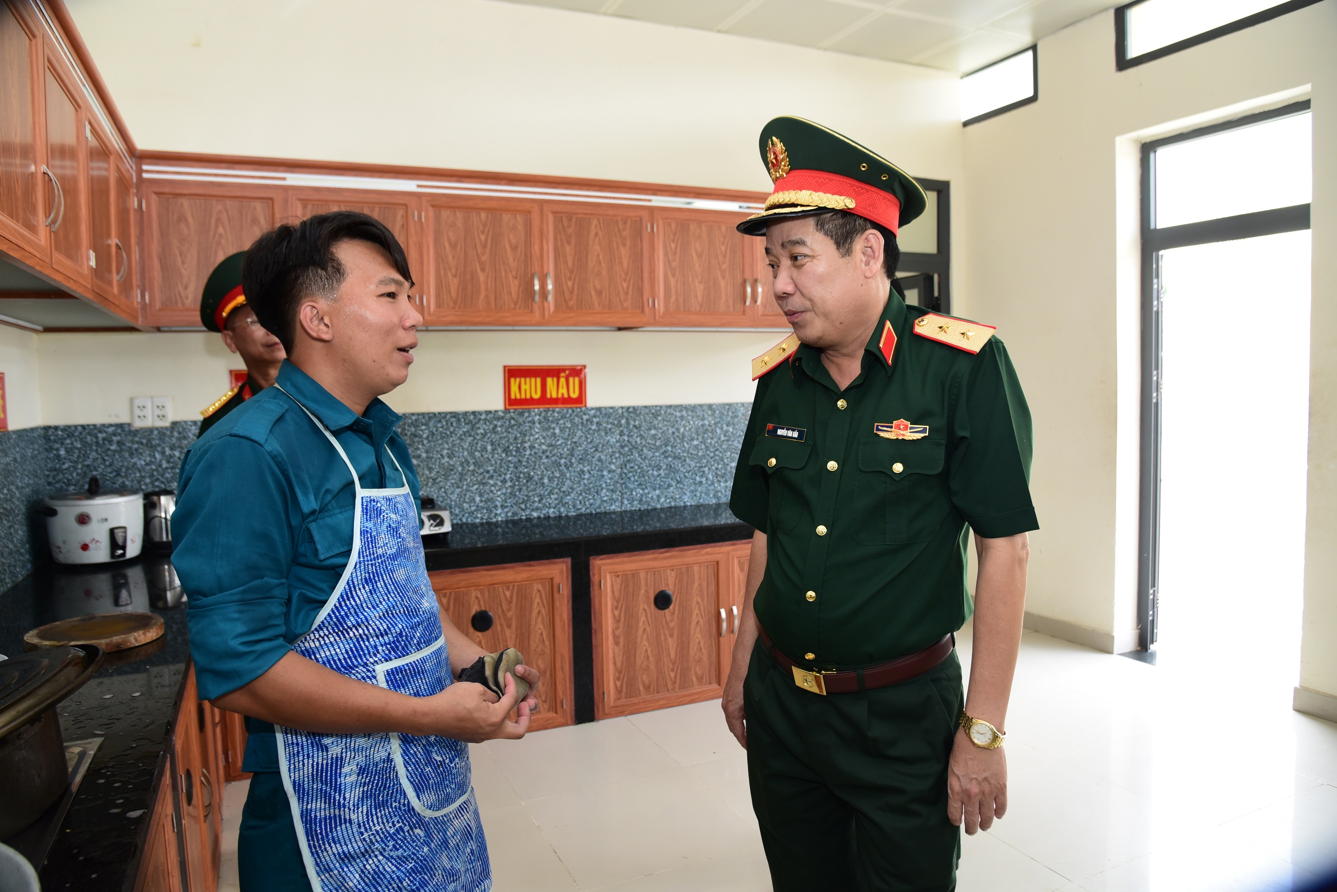 Trung tướng Nguyễn Văn Gấu, Ủy viên Trung ương Đảng, Phó Chủ nhiệm Tổng cục Chính trị QĐNDVN trò chuyện với chiến sĩ dân quân phục vụ bếp.