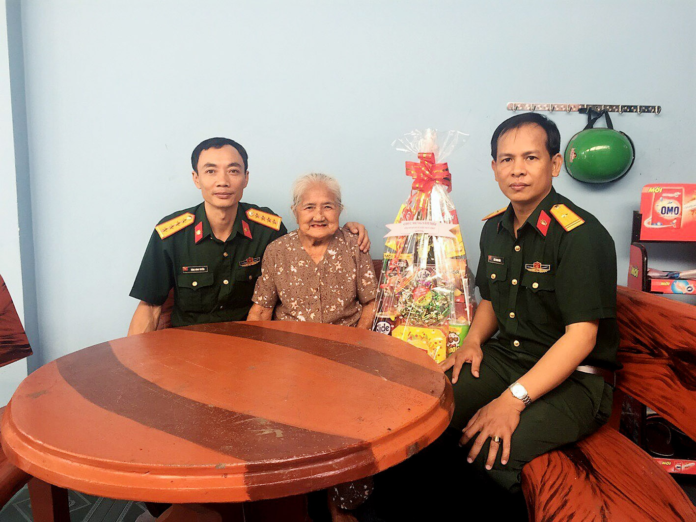 Đại úy QNCN Tăng Đình Tuyến (bên trái) cùng chỉ huy cơ quan thăm, tặng quà gia đình chính sách.