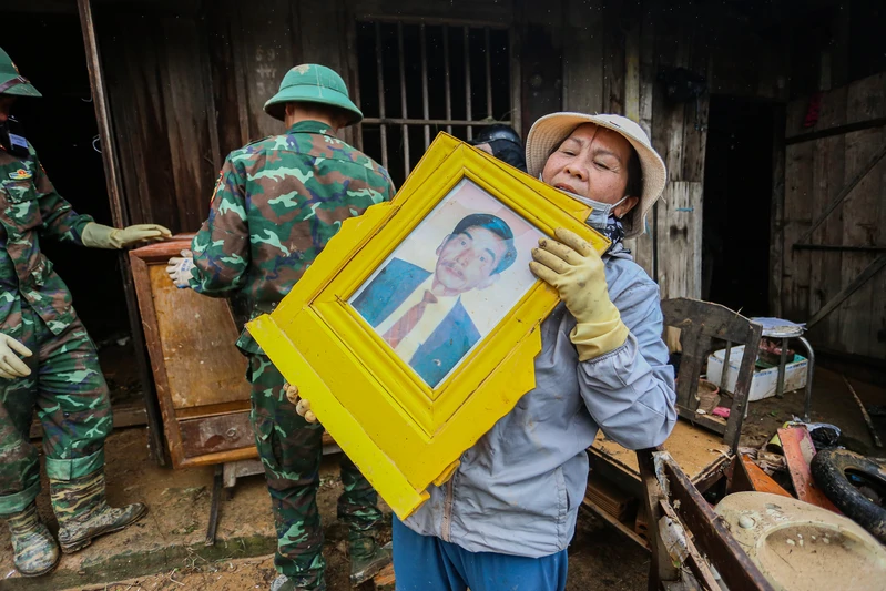 Căn nhà thờ tổ bị ngập, hư hỏng hoàn toàn; chị Lê Thị Thủy ôm chặt di ảnh người thân vào lòng.