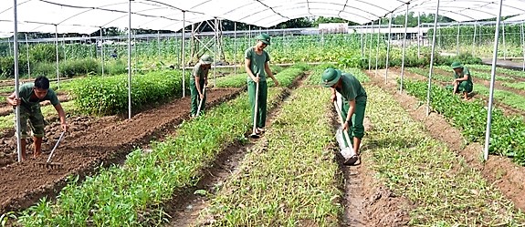 Hiện tại, khu TGSX tập trung của Lữ đoàn có vườn rau sạch rộng gần 34.000m2, được quy hoạch từng khu vực trồng rau đẹp mắt, có lưới che cẩn thận với nhiều loại rau lấy lá xanh mướt. Tại khu vực đất bạc màu, đơn vị bố trí làm chuồng nuôi gia súc, gia cầm và đào ao thả cá với diện tích mặt nước 10.000m2, phía trên có giàn mướp, bầu, bí… trĩu quả. Tận dụng các bãi, bờ đất trống trong khuôn viên đơn vị, xen canh trong khu tăng gia, Lữ đoàn trồng được hơn 13.000 cây ăn trái như mít, xoài, bưởi, ổi, chuối…