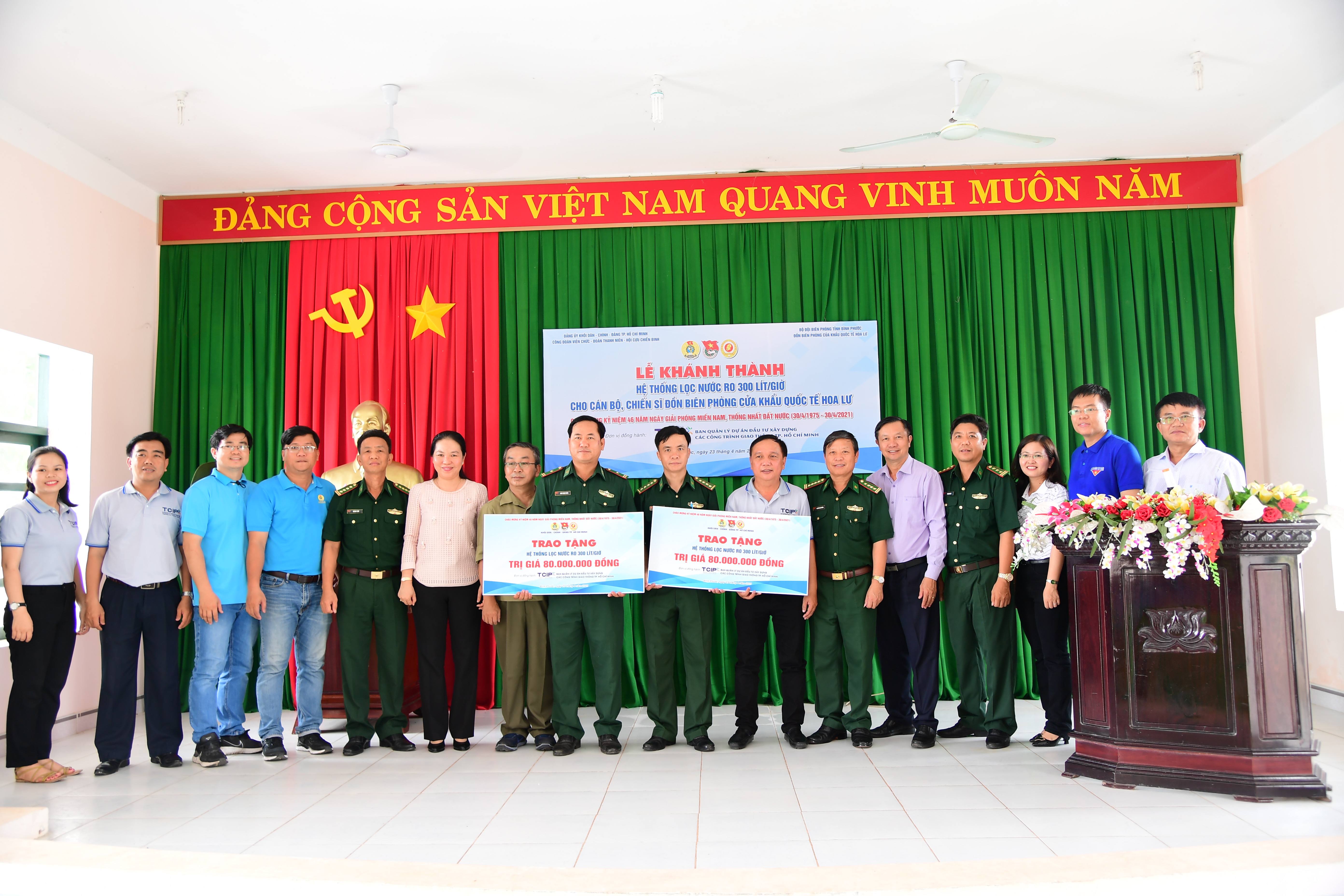 Đơn vị tài trợ trao bảng tượng trưng hệ thống lọc nước cho Đồn và Trạm kiểm soát Cửa khẩu quốc tế Hoa Lư.