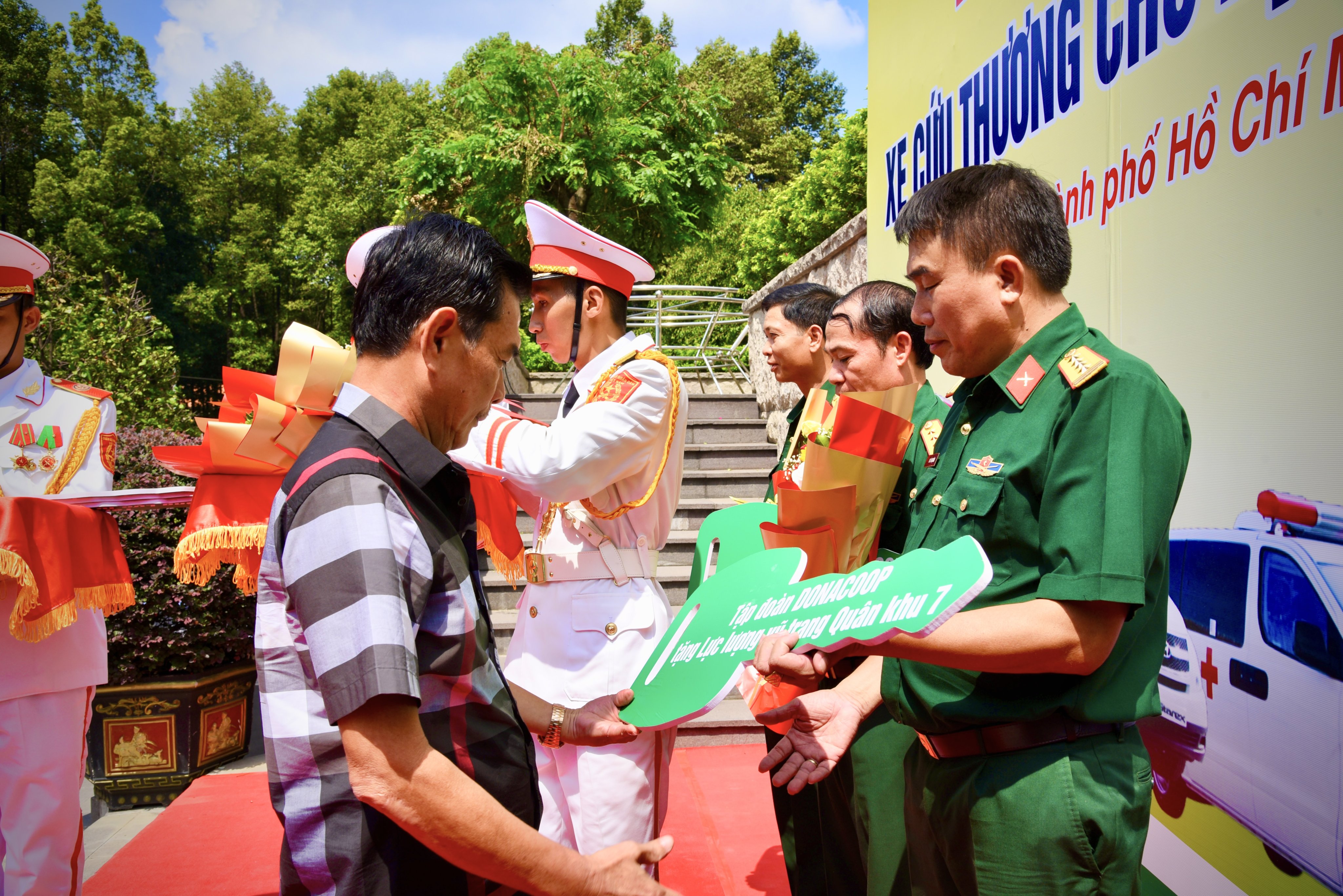 Ông Bùi Thanh Trúc, Chủ tịch HĐQT, Tổng Giám đốc Công ty Donacoop trao chìa khoá biểu trưng xe cứu thương tặng các đơn vị LLVT Quân khu.