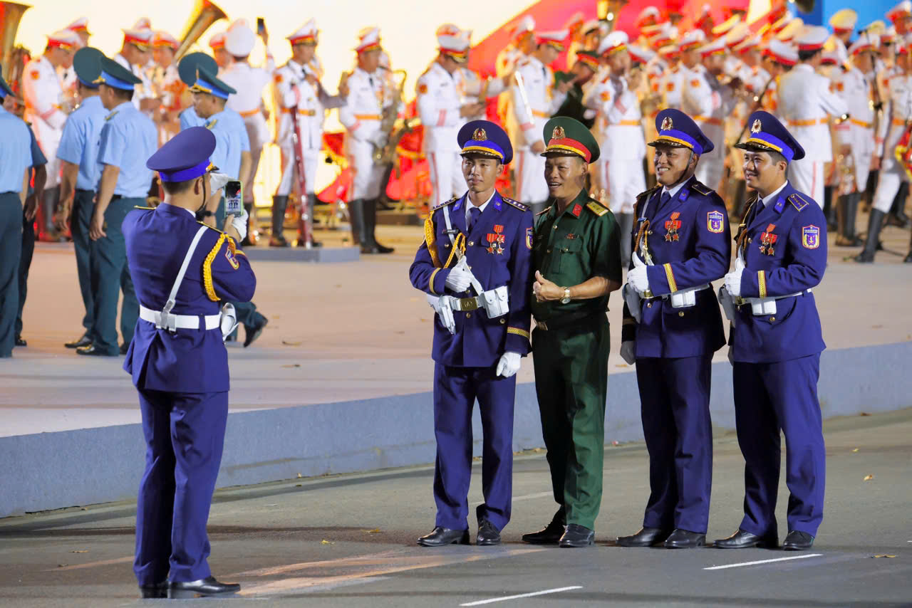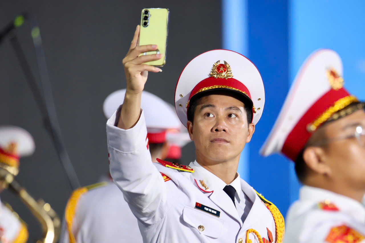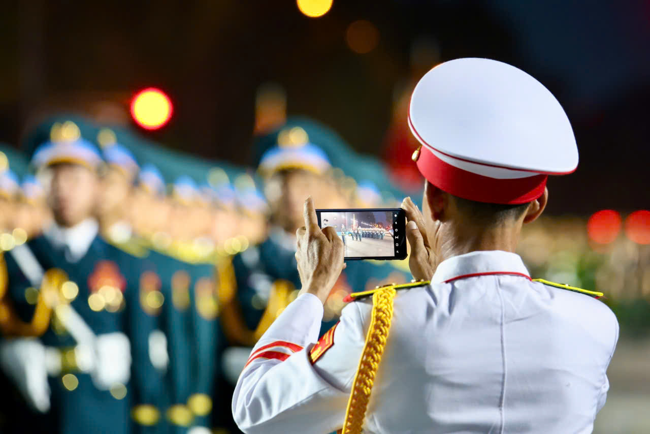 Giữa ánh sáng đèn rực rỡ của phố đêm, chiến sĩ khối Quân nhạc tranh thủ lưu giữ khoảnh khắc đội hình diễu hành – những bước chân đều tắp, khắc họa niềm tự hào dân tộc trong từng thước phim.