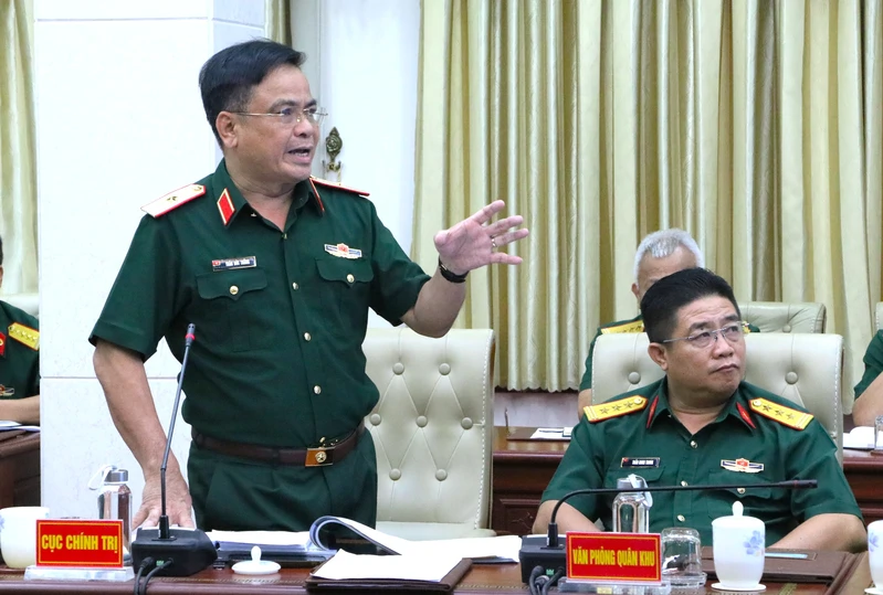 Thiếu tướng Trần Đức Thắng, Phó Chủ nhiệm Chính trị Quân khu phát biểu tại hội nghị.