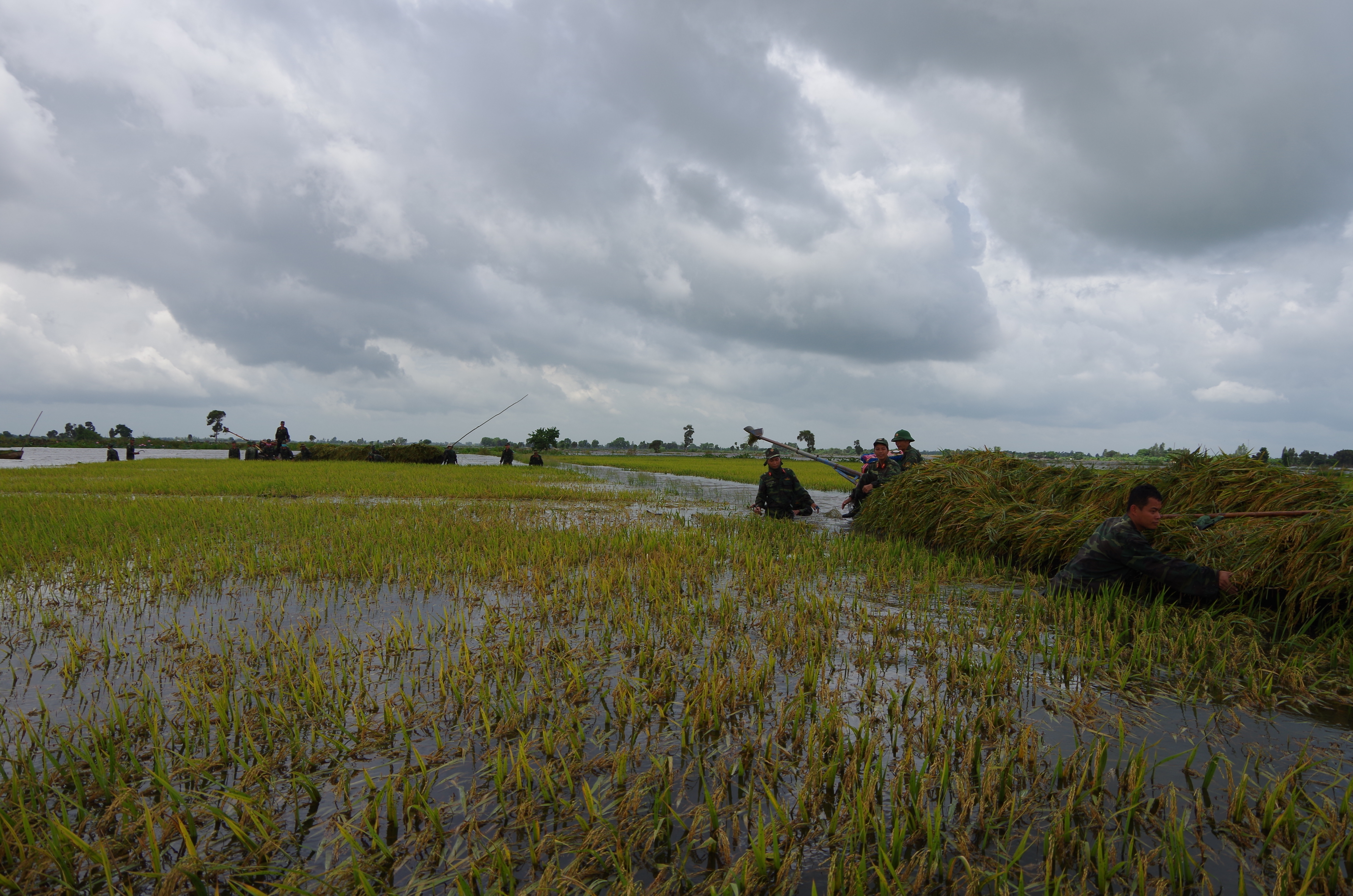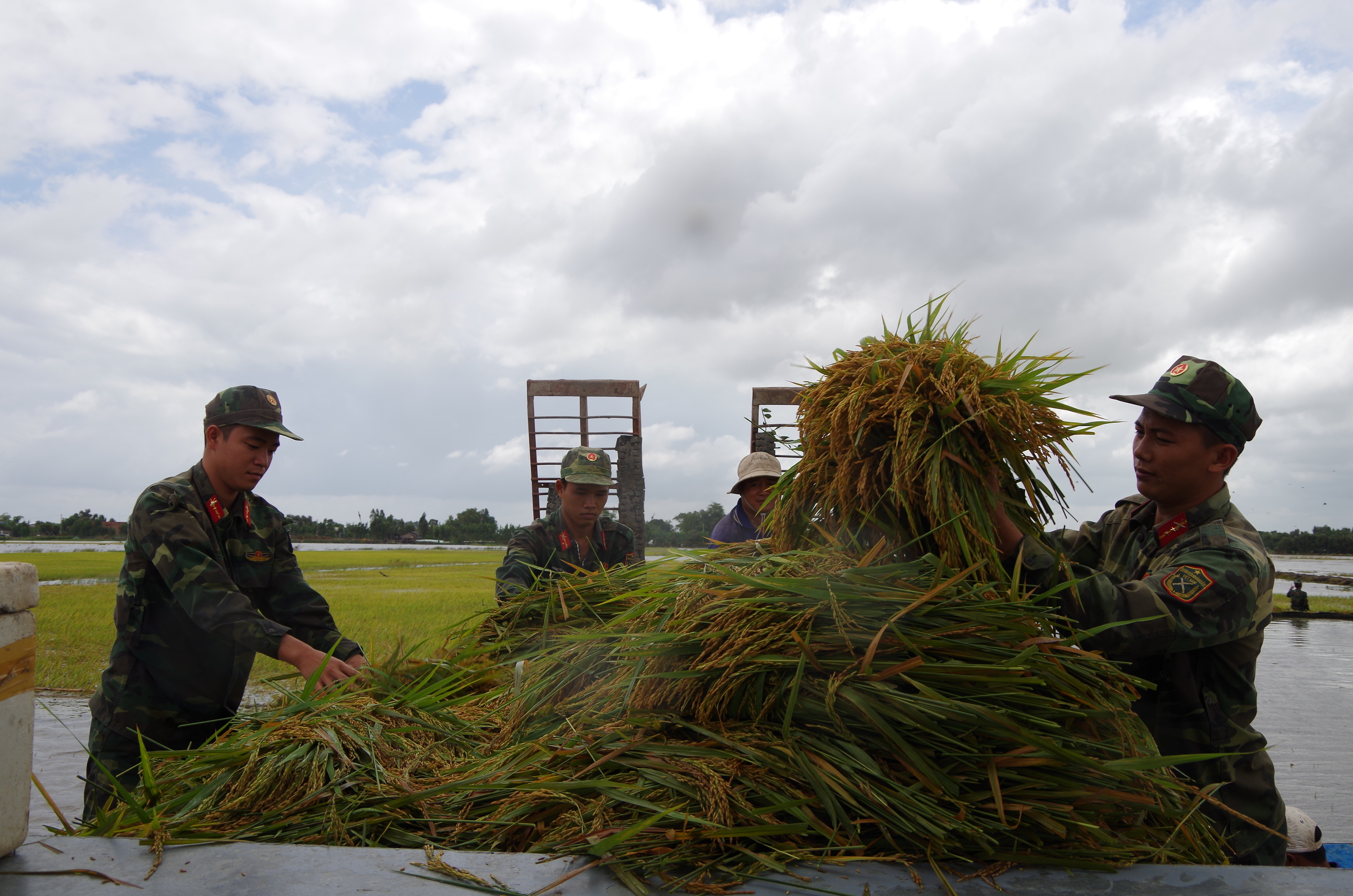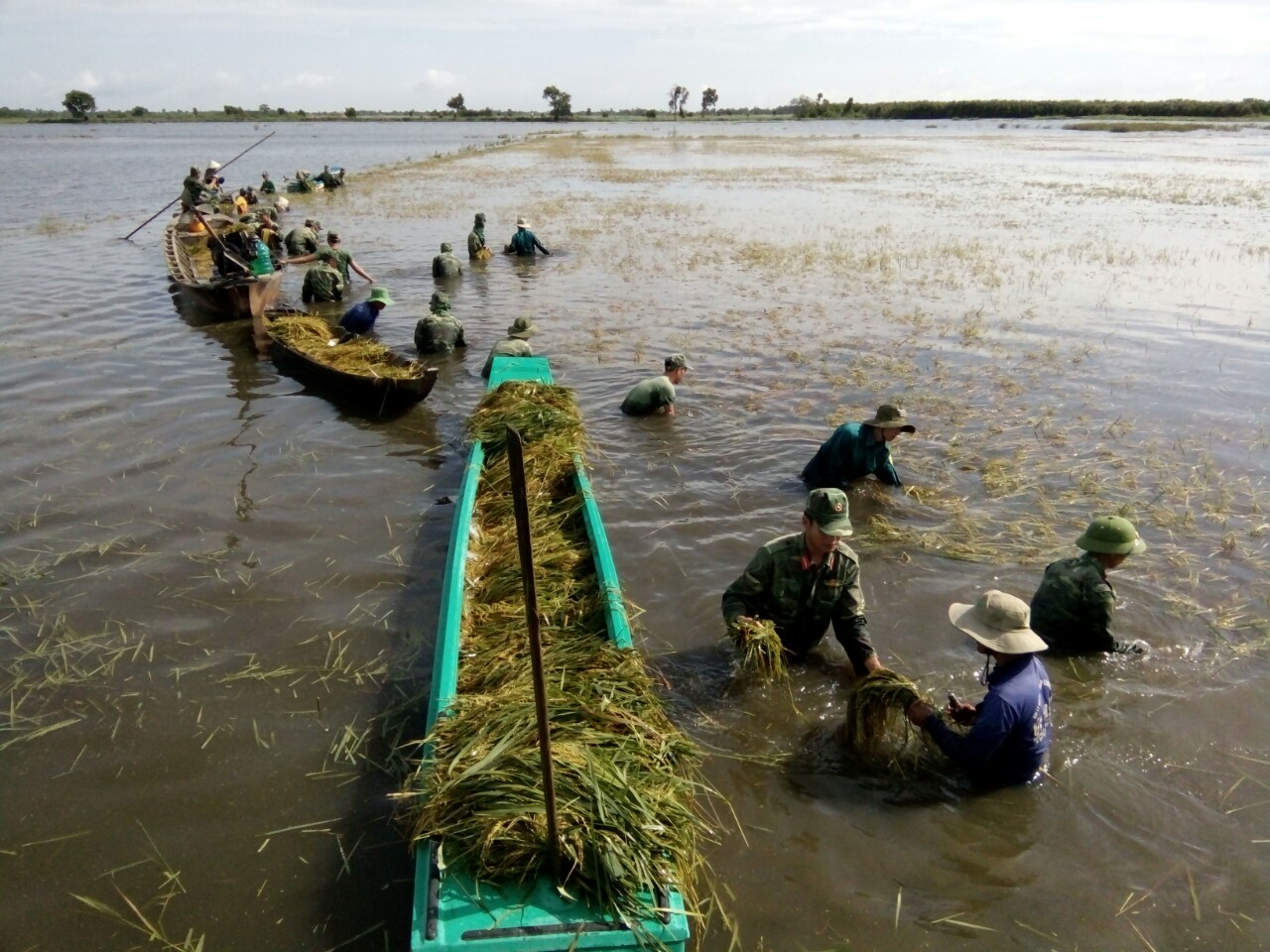 Hay tin ruộng lúa của bà con tới ngày thu hoạch bị ngập do vỡ đê tối qua, cán bộ, chiến sĩ Đại đội bộ binh huyện Vĩnh Hưng nhanh chóng hành quân xuống xã Tuyên Bình Tây giúp dân gặt lúa chạy lũ. Tới nơi chỉ hơn 7 giờ sáng, mặc cho trời mưa dầm, các anh trầm mình dưới nước cắt từng bông lúa đang chìm sâu trong làn nước. Để làm được nhanh, đơn vị chia thành từng nhóm chiến sĩ để cắt lúa, chiến sĩ  nào khỏe hơn thì ôm lúa chất lên xuồng và đẩy về nhà cho bà con, nhóm còn lại cùng bà con gia cố lại các đoạn đê. Hơn 12 giờ trưa, quần áo ướt sũng, cán bộ, chiến sĩ lên gò cao gần đó ăn vội bữa cơm trưa do anh nuôi đơn vị mang đến rồi tiếp tục bắt tay vào công việc.