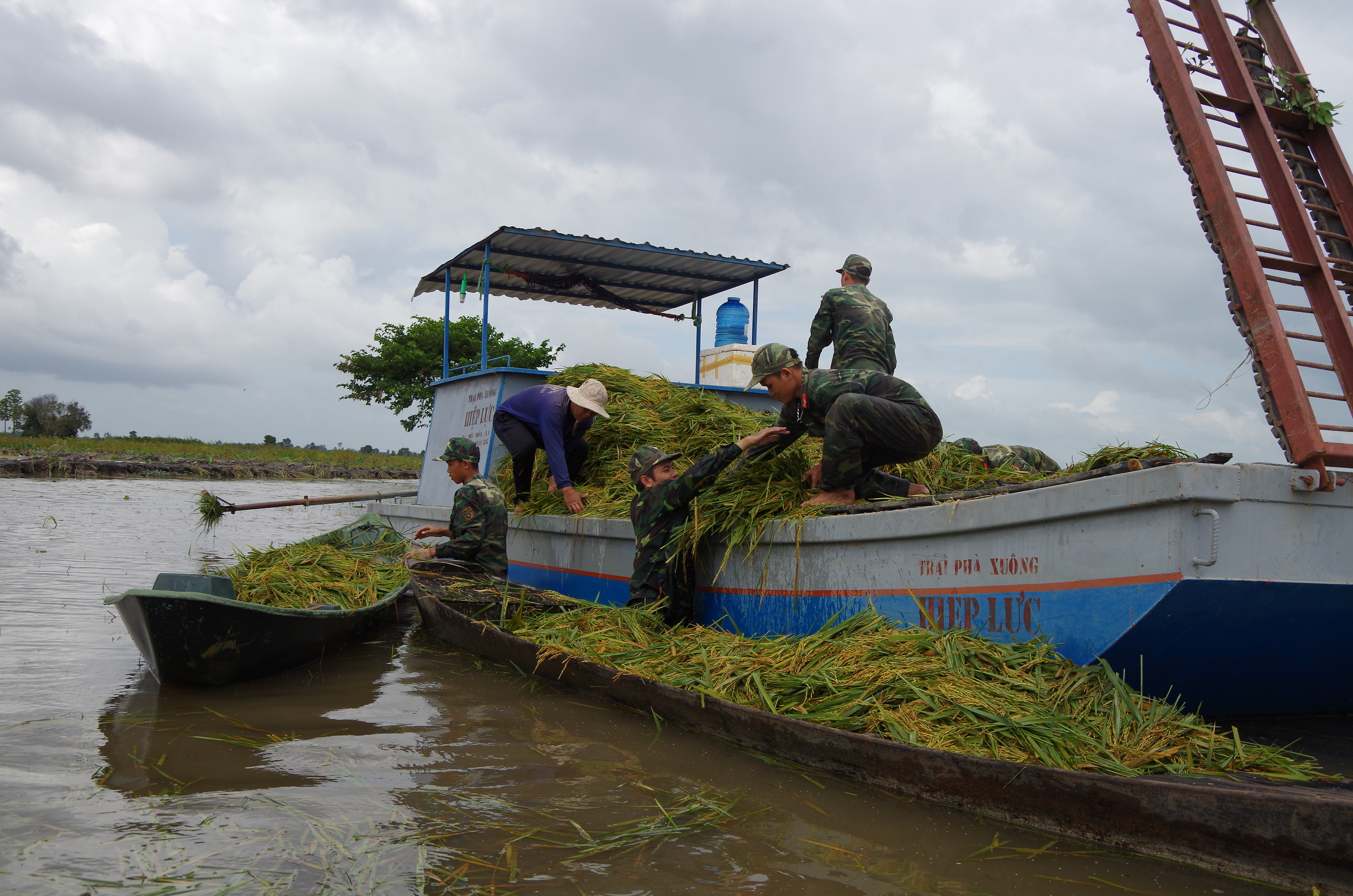 Lội đẩy chiếc xuồng chở lúa đầy ắp đưa lên gò cao cách đó hơn 1km, gạt vội mồ hôi chảy ròng trên khuôn mặt, binh nhì Lê Xuân Trường - Tiểu đội 4 - Trung đội 1 phấn khởi nói: Từ khi nhập ngũ đến nay đây là lần đầu tiên em tham gia làm công tác dân vận với thời gian lâu nhất. Do trước giờ không biết cắt lúa, mà cắt lúa dưới nước nên em xung phong đẩy xuồng chở lúa về. Giúp được cho bà con cũng như giúp gia đình mình vậy.