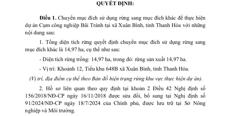 Việc chuyển mục đích sử dụng rừng lần này nhằm phục vụ Cụm công nghiệp Bãi Trành - một dự án đã được thành lập từ năm 2022, với quy mô khoảng 33,66 ha, đặt tại xã Xuân Bình (huyện Như Xuân cũ). Cụm công nghiệp được định hướng trở thành điểm đến của nhiều ngành nghề sản xuất đa dạng như may mặc, tiểu thủ công nghiệp, sản xuất vật liệu xây dựng, nội thất, cơ khí, điện - điện tử, chế biến thực phẩm, dược liệu, lâm sản, nhựa, cũng như chế biến thức ăn chăn nuôi.