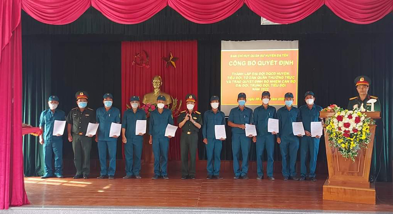 Nhằm nêu cao vị trí, vai trò của lực lượng dân quân trong tình hình mới; đồng thời, nâng cao chất lượng, hiệu quả hoạt động của lực lượng dân quân tự vệ trong công tác quân sự quốc phòng theo Luật Dân quân tự vệ; bảo đảm thực hiện tốt nhiệm vụ sẵn sàng chiến đấu tại đơn vị, góp phần giữ vững ổn định tình hình an ninh chính trị, trật tự an toàn xã hội trên địa bàn huyện, Ban Chỉ huy Quân sự huyện Đạ Tẻh quyết định thành lập đại đội đân quân cơ động huyện; đồng thời, trao Quyết định của Bộ Chỉ huy Quân sự tỉnh về công tác cán bộ dân quân tự vệ.