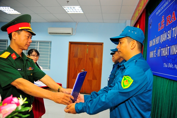 Phát biểu chỉ đạo tại lễ ra mắt lực lượng tự vệ nhà trường, Trung tá Nguyễn Nhâm, Phó Chỉ huy trưởng – Tham mưu trưởng Ban Chỉ huy Quân sự quận Thủ Đức chúc mừng và giao nhiệm vụ cho Ban Chỉ huy Quân sự Nhà trường. Đồng chí mong rằng, đây là bước ngoặt trong tiến trình xây dựng, phát triển của nhà trường trong thời kỳ mới. Vì thế cán bộ, chiến sĩ tự vệ của đơn vị phải không ngừng học tập, rèn luyện, phấn đấu về mọi mặt vượt qua khó khăn hoàn thành tốt chức trách nhiệm vụ được giao.