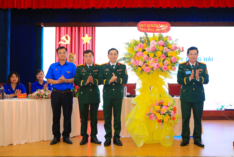Đại tá Lê Văn Tuấn, Bí thư Đảng ủy, Chủ tịch Công ty Đông Hải tặng hoa chúc mừng Ban Chấp hành Đoàn cơ sở Công ty Đông Hải, nhiệm kỳ 2025 – 2030.