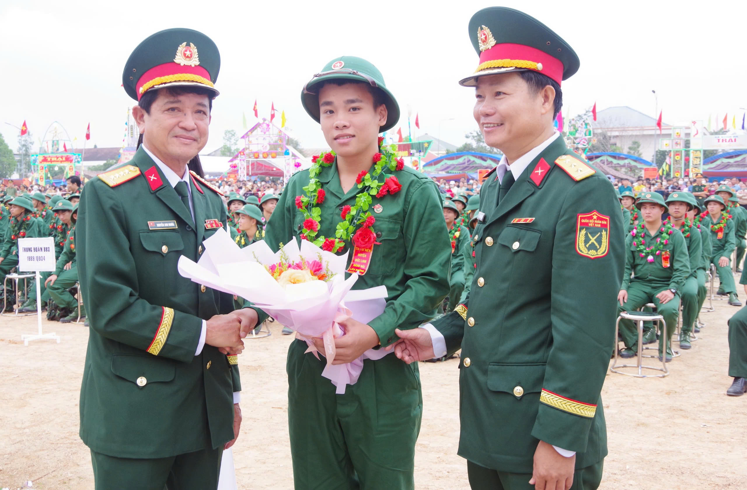 Đại tá Nguyễn Anh Nghĩa, Chỉ huy trưởng Bộ CHQS tỉnh tặng hoa, quà động viên thanh niên huyện Đức Linh nhập ngũ.