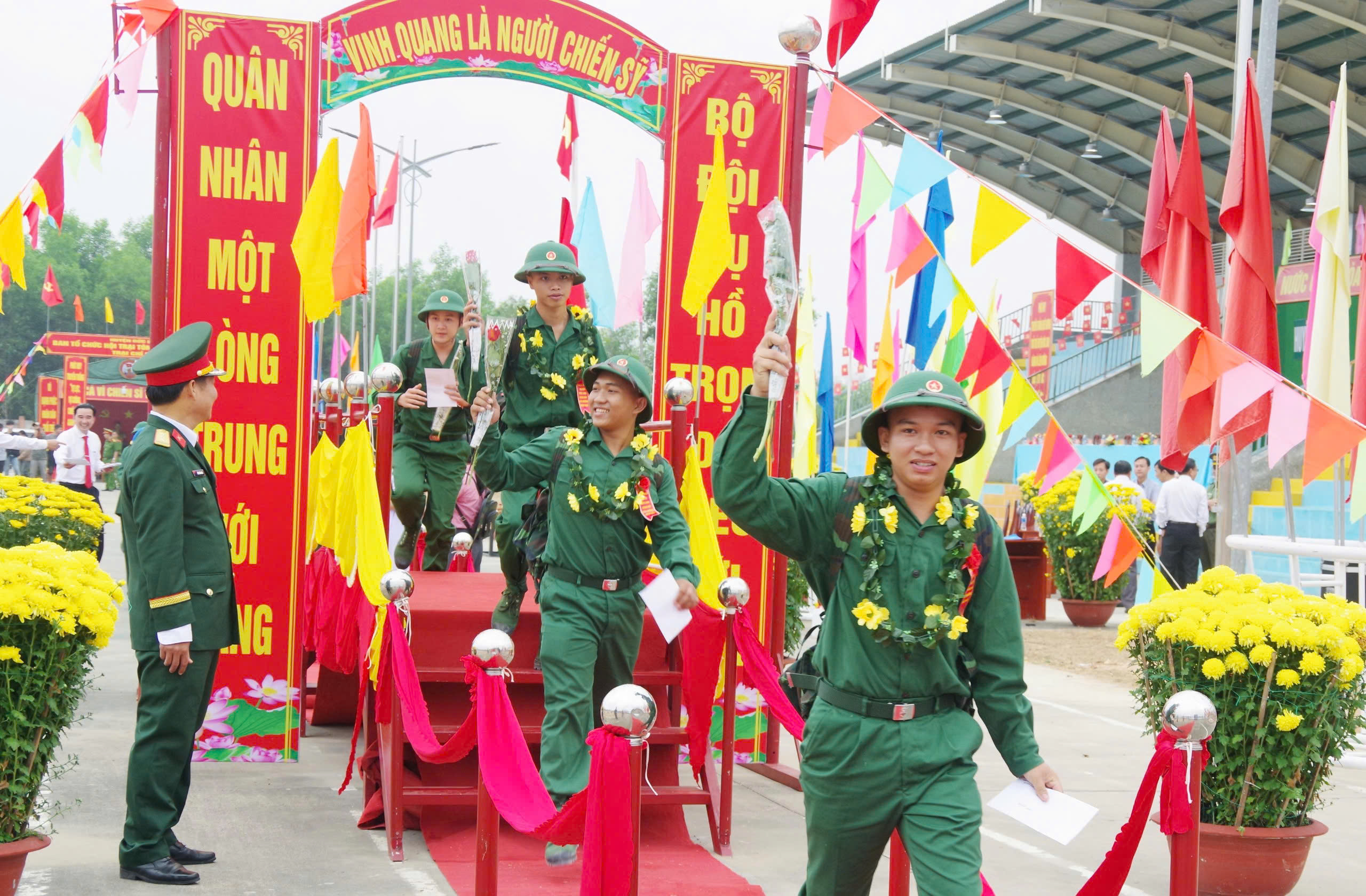 Những thanh niên huyện Đức Linh, phấn khởi, rạng ngời, tự hào bước qua cầu Vinh quang, chào tạm biệt gia đình và người thân lên xe về đơn vị Quân đội, Công an thực hiện nhiệm vụ bảo vệ Tổ quốc.