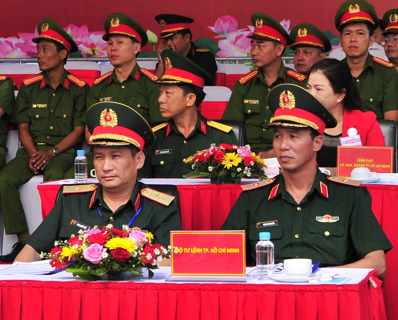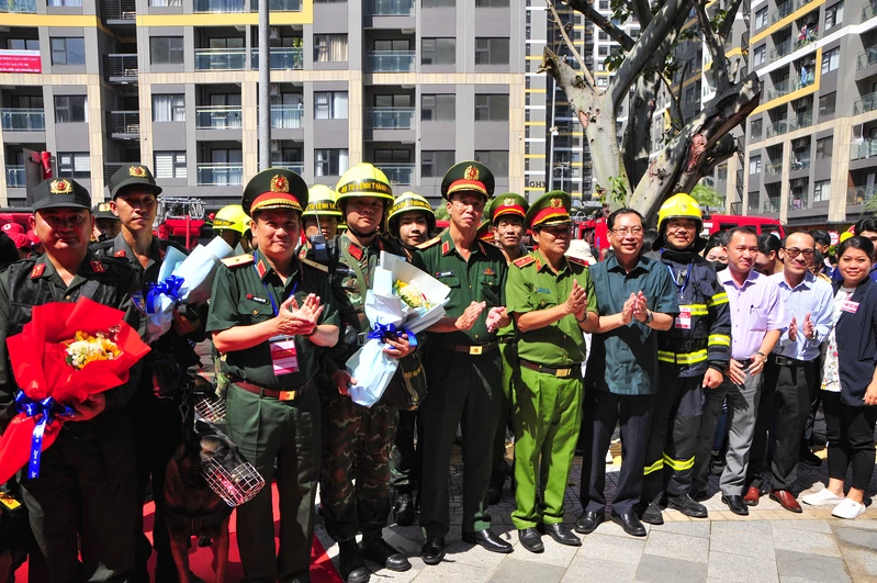 Thủ trưởng Bộ Tư lệnh Thành phố Hồ Chí Minh cùng lãnh đạo sở ngành tặng hoa động viên các lực lượng tham gia diễn tập.