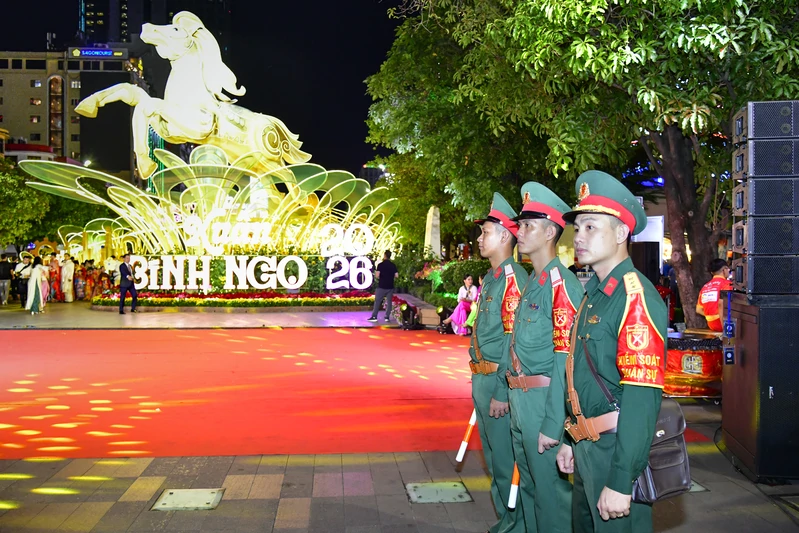 Tiểu đoàn 31, Bộ Tư lệnh TP Hồ Chí Minh tuần tra trước giờ khai mạc Đường hoa Nguyễn Huệ (Ảnh: Hữu Tân).