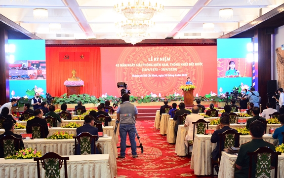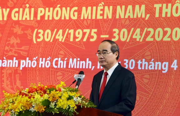 Thay mặt lãnh đạo TP Hồ Chí Minh, đồng chí Nguyễn Thiện Nhân đọc diễn văn kỷ niệm ôn lại truyền thống hào hùng của dân tộc, ý nghĩa lịch sử và tầm vóc thời đại của cuộc kháng chiến chống Mỹ, cứu nước với điểm nhấn Chiến dịch Hồ Chí Minh lịch sử. Đồng chí Nguyễn Thiện Nhân khẳng định, Đại thắng mùa Xuân năm 1975 là một trang sử hào hùng trong lịch sử dựng nước và giữ nước của dân tộc ta, đưa nước ta bước vào kỷ nguyên mới, kỷ nguyên của độc lập, thống nhất, toàn vẹn lãnh thổ, xây dựng nước Việt Nam xã hội chủ nghĩa, dân giàu, nước mạnh, dân chủ, công bằng, văn minh. Đảng bộ, chính quyền và nhân dân thành phố đã trải qua 45 năm năng động, sáng tạo, đoàn kết, nghĩa tình, phấn đấu với quyết tâm cao để xây dựng, bảo vệ và phát triển thành phố xứng đáng và vinh dự thành phố mang tên Bác - thành phố anh hùng. Thành phố đã đạt được nhiều thành tựu to lớn như kinh tế tăng trưởng cao nhất, giữ vững vị trí đầu tàu kinh tế của cả nước, đóng góp lớn nhất vào tổng sản phẩm nội địa và thu ngân sách của cả nước.