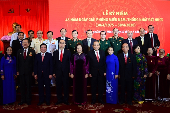 Đến dự lễ tại điểm cầu Hội trường Thống Nhất có các đồng chí: Nguyễn Thị Kim Ngân, Ủy viên Bộ Chính trị, Chủ tịch Quốc hội; Trương Hòa Bình, Ủy viên Bộ Chính trị, Phó thủ tướng Thường trực Chính phủ; Nguyễn Thiện Nhân, Ủy viên Bộ Chính trị, Bí thư Thành ủy TP Hồ Chí Minh; Trần Lưu Quang, Ủy viên Trung ương Đảng, Phó bí thư Thường trực Thành ủy Thành phố; Nguyễn Thành Phong, Ủy viên Trung ương Đảng, Phó bí thư Thành ủy, Chủ tịch UBND Thành phố; Trung tướng Trần Hoài Trung, Chính ủy Quân khu 7. Cùng dự lễ có các Bà mẹ Việt Nam Anh hùng, các nhân chứng lịch sử đã tham gia Chiến dịch Hồ Chí Minh lịch sử, đại biểu các sở, ban, ngành, các tầng lớp nhân dân, nhân sĩ trí thức, chức sắc tôn giáo, dân tộc, tuổi trẻ thành phố.