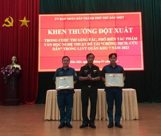 Dịp này, Ban CHQS thành phố Thủ Dầu Một trao quyết định khen thưởng đột xuất của UBND thành phố Thủ Dầu Một cho tập thể và cá nhân có thành tích xuất sắc trong cuộc thi sáng tác, phổ biến tác phẩm văn học nghệ thuật đề tài “Chống dịch, cứu dân” trong LLVT Quân khu 7 năm 2023.
