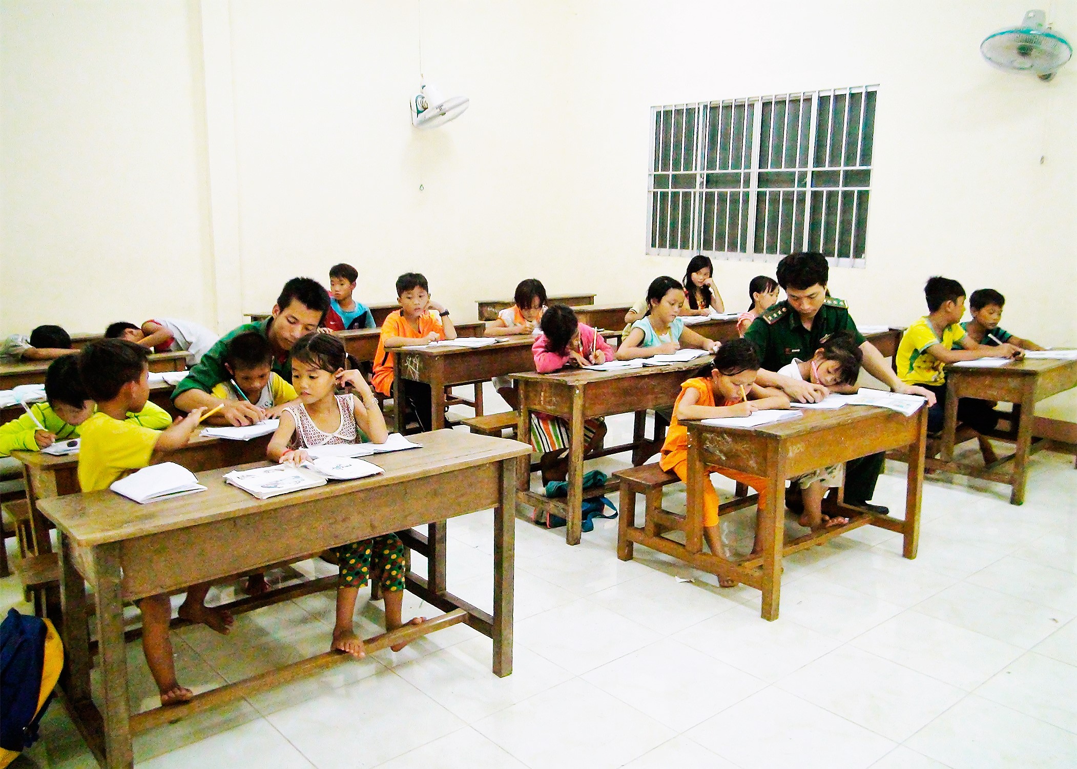 Theo chân cán bộ, chiến sĩ Đồn Biên phòng Tuyên Bình, huyện Vĩnh Hưng, tỉnh Long An, chúng tôi về thăm lớp học “Tình thương” do các cán bộ chiến sĩ Đồn Biên phòng trực tiếp giảng dạy. Năm qua, đều đặn từ 18 giờ đến 20 giờ hàng ngày lại vang lên tiếng học bài của các em nhỏ. Đây là việc làm ý nghĩa thiết thực, nhằm tạo điều kiện thuận lợi cho con em người Việt Nam di cư tự do từ Campuchia về có điều kiện theo học.