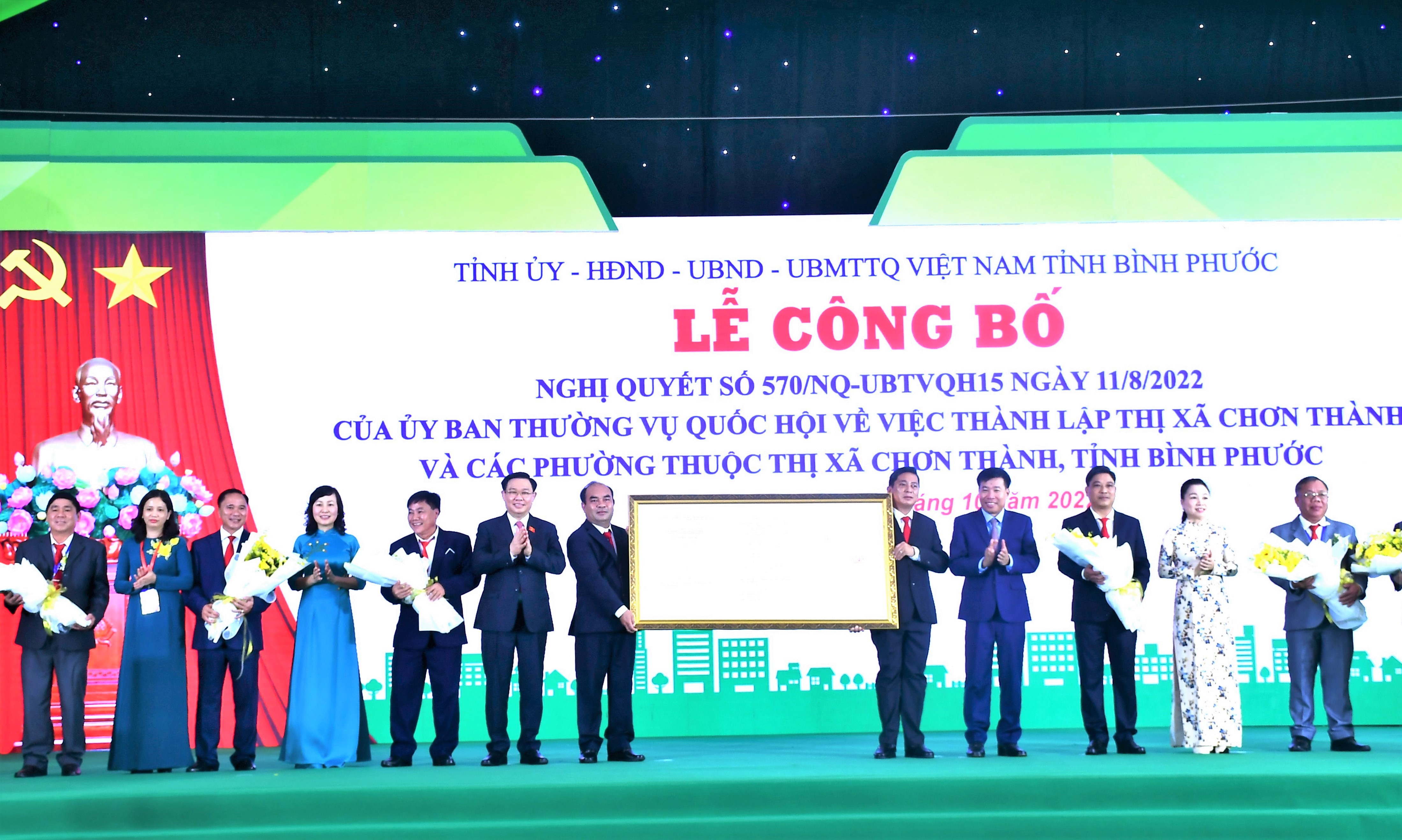 Thay mặt lãnh đạo Đảng, Nhà nước và Ủy ban Thường vụ Quốc hội, Chủ tịch Quốc hội Vương Đình Huệ phát biểu chúc mừng và trao Nghị quyết số 570 của Ủy ban Thường vụ Quốc hội cho đại diện lãnh đạo thị xã Chơn Thành... Đồng chí yêu cầu thị xã cần tập trung quán triệt nghiêm túc, thực hiện tốt các quan điểm, chủ trương, đường lối của Đảng, triển khai có hiệu quả các giải pháp nhằm nâng cao chất lượng đô thị, phát triển đô thị bền vững như: xây dựng văn hóa và lối sống đô thị văn minh, hoàn thiện quy hoạch không gian văn hóa đô thị đáp ứng nhu cầu sáng tạo và hưởng thụ của người dân, chú trọng tạo dựng nhiều không gian văn hóa công cộng, ưu tiên nguồn lực phát triển các dịch vụ xã hội cơ bản tại đô thị, nhất là dịch vụ giáo dục, y tế và chăm sóc sức khỏe.