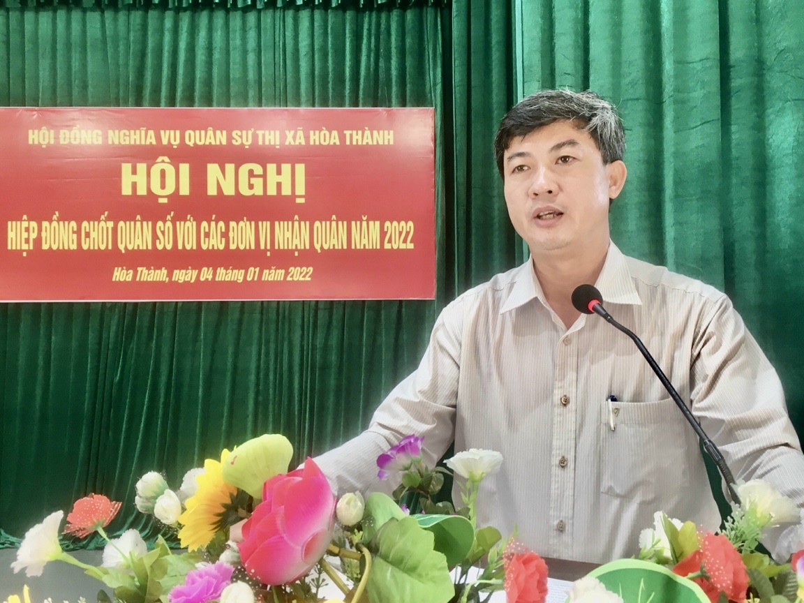 Sau khi nghe cơ quan thường trực báo cáo kết quả thâm nhập hồ sơ công dân nhập ngũ các đơn vị nhận quân thông qua danh sách giao quân, số lượng, chất lượng, đồng chí Chủ tịch Hội đồng NVQS thị xã đề nghị UBND các xã, phường cùng các đơn vị tiếp tục làm tốt công tác tuyên truyền vận động công dân chấp hành nghiêm lệnh gọi công dân nhập ngũ. Quan tâm thực hiện tốt công tác chính sách các gia đình quân nhân trúng tuyển, xây dựng kế hoạch tổ chức lễ giao nhận quân đạt 100% chỉ tiêu trên giao, phải bảo đảm tốt công tác phòng, chống dịch Covid -19 trong tiễn quân năm 2022. Nhân dịp đầu năm mới 2022, đồng chí Chủ tịch UBND thị xã chúc các đồng chí mạnh khỏe, hạnh phúc, hoàn thành tốt nhiệm vụ.