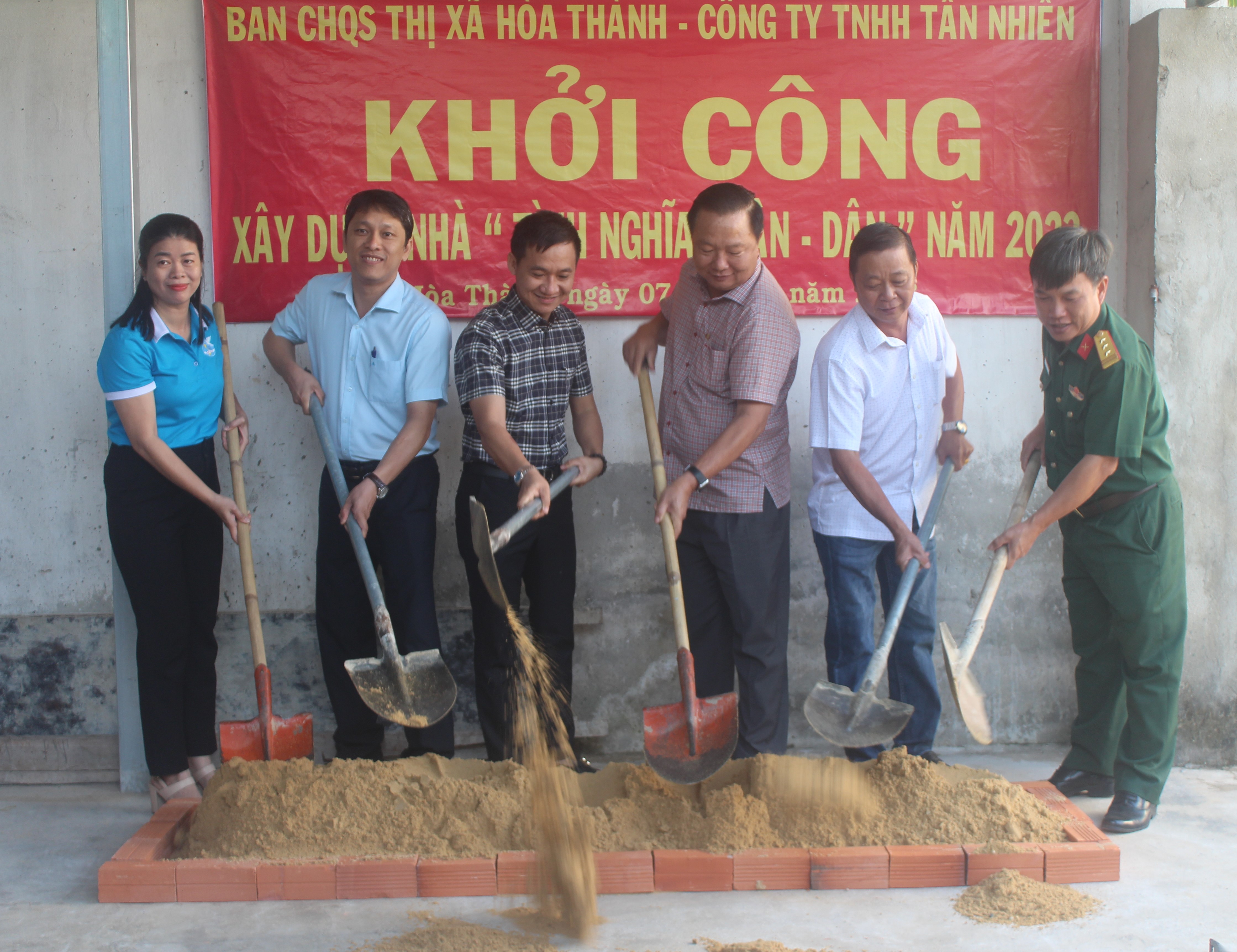 (QK7 Online) - Tại khu phố Long Thành, phường Long Thành Trung, thị xã Hòa Thành, tỉnh Tây Ninh, ngày 7-3, Ban CHQS thị xã Hòa Thành phối hợp với Công ty TNHH Tân Nhiên trao kinh phí và khởi công xây dựng “Nhà tình nghĩa quân - dân” cho gia đình Binh nhì Trương Minh Tài, đang huấn luyện chiến sĩ mới tại Tiểu đoàn huấn luyện Bộ chỉ huy Bộ đội Biên phòng tỉnh Tây Ninh.