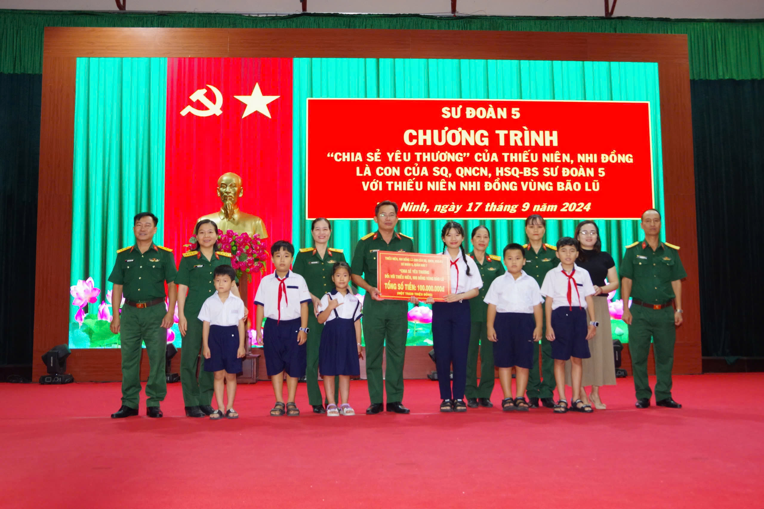 Sư đoàn 5 nhận số tiền biểu trưng 100 triệu đồng của các cháu thiếu niên, nhi đồng là con của cán bộ, chiến sĩ Sư đoàn chia sẻ yêu thương với thiếu niên, nhi đồng vùng bão lũ.