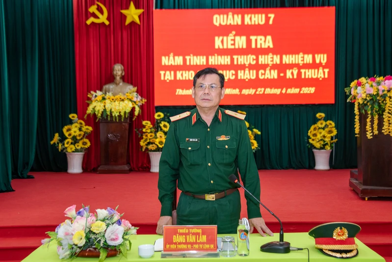 (QK7 Online) - Ngày 22 tháng 4, đoàn công tác Quân khu 7 do Thiếu tướng Đặng Văn Lẫm, Ủy viên Ban thường vụ Đảng ủy Quân khu, Phó Tư lệnh Quân khu làm trưởng đoàn đến kiểm tra nắm tình hình thực hiện nhiệm vụ tại Xưởng Z735, Cục Hậu cần - Kỹ thuật Quân khu. Tham gia đoàn công tác có Đại tá Lê Chí Dũng, Phó Chủ nhiệm Hậu cần - Kỹ thuật Quân khu.