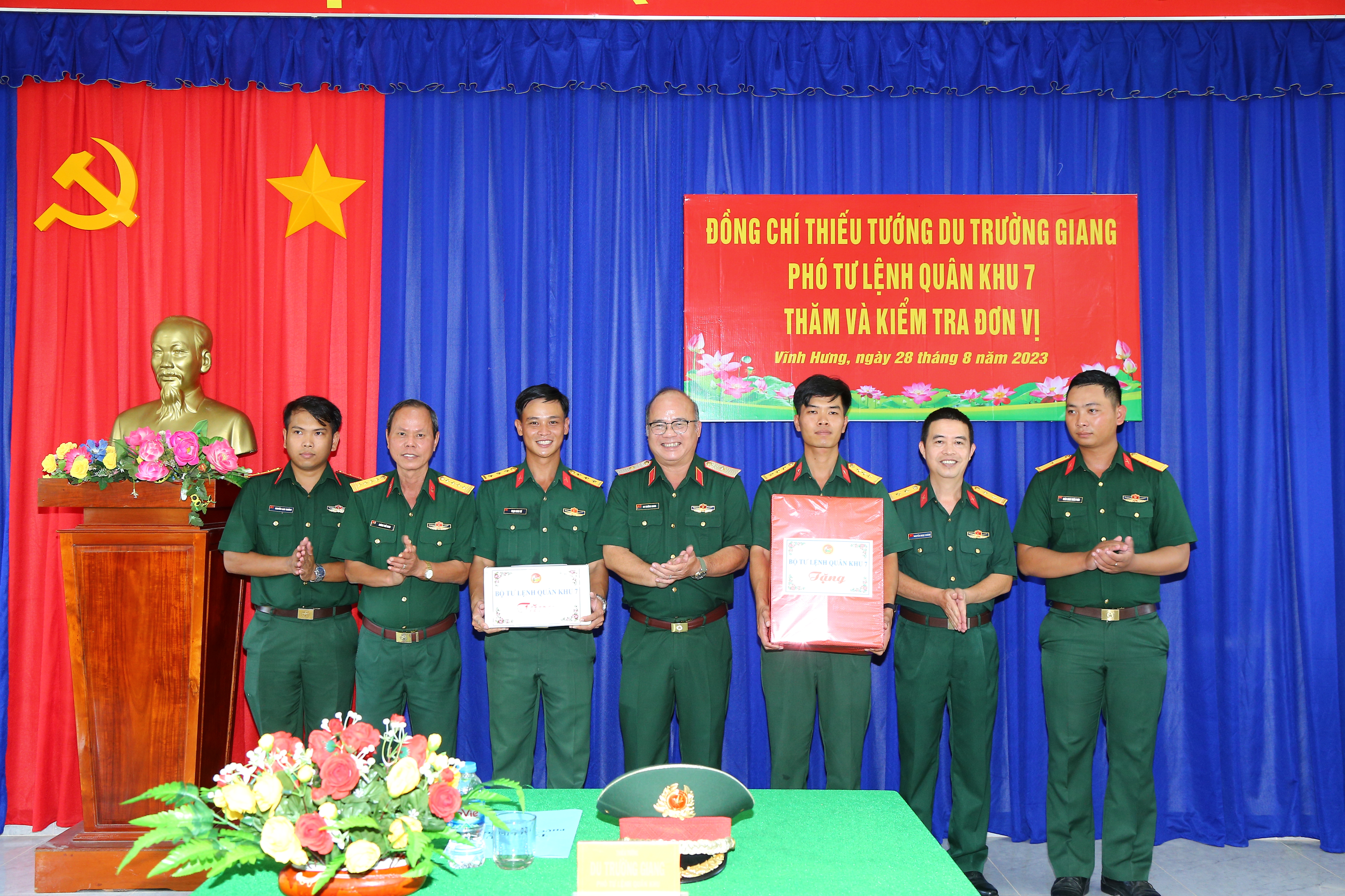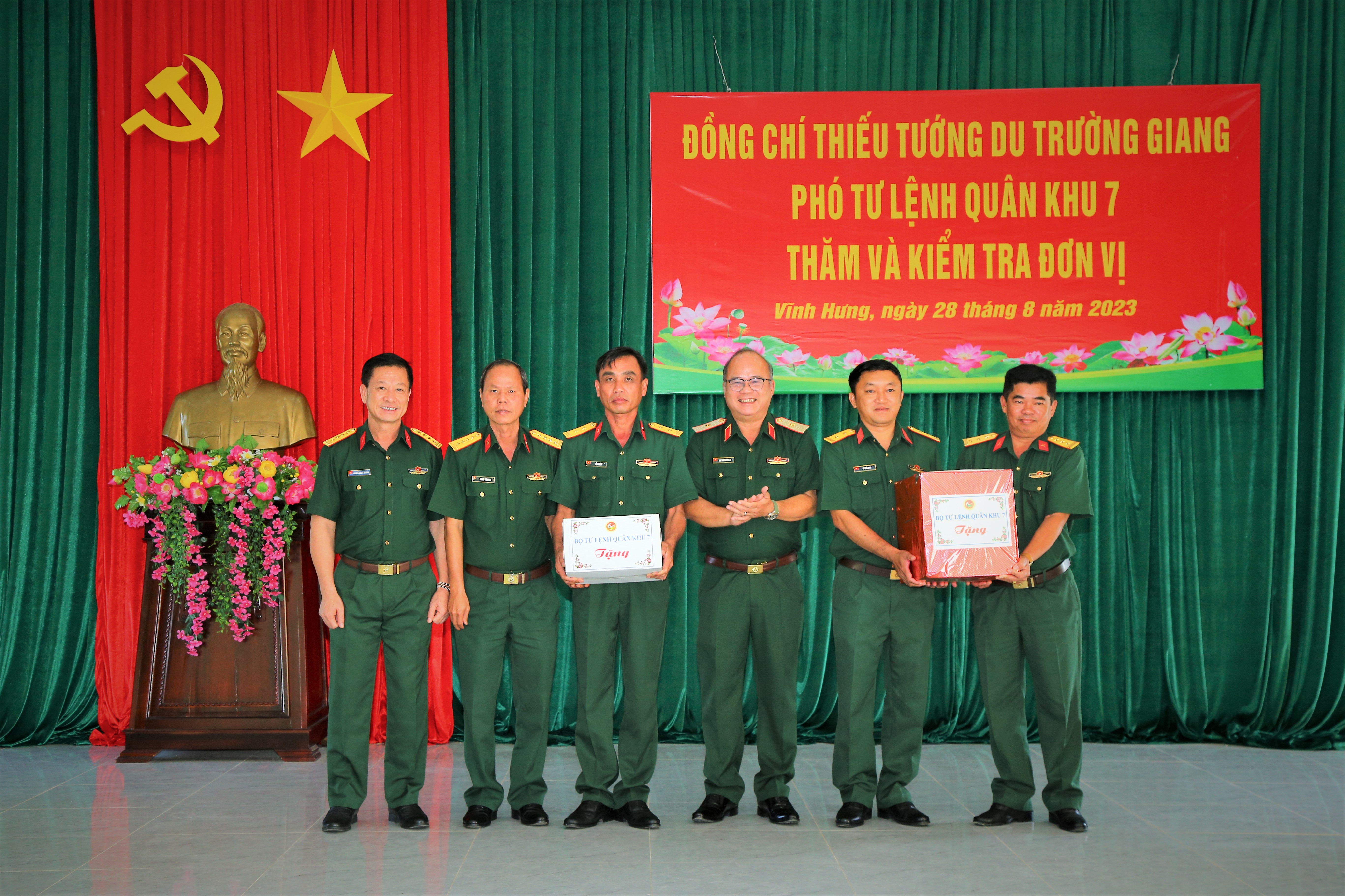 Thiếu tướng Du Trường Giang, Phó Tư lệnh Quân khu 7 và lãnh đạo Công ty Đông Hải, Công ty Tây Nam tặng quà cho Ban CHQS huyện Vĩnh Hưng.
