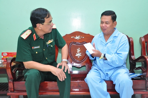 Thay mặt Đảng ủy, Bộ Tư lệnh Quân khu 7, Thiếu tướng Nguyễn Minh Hoàng ân cần thăm hỏi và bày tỏ sự vui mừng khi biết sức khỏe của Trung tướng Som Sun đã ổn định.