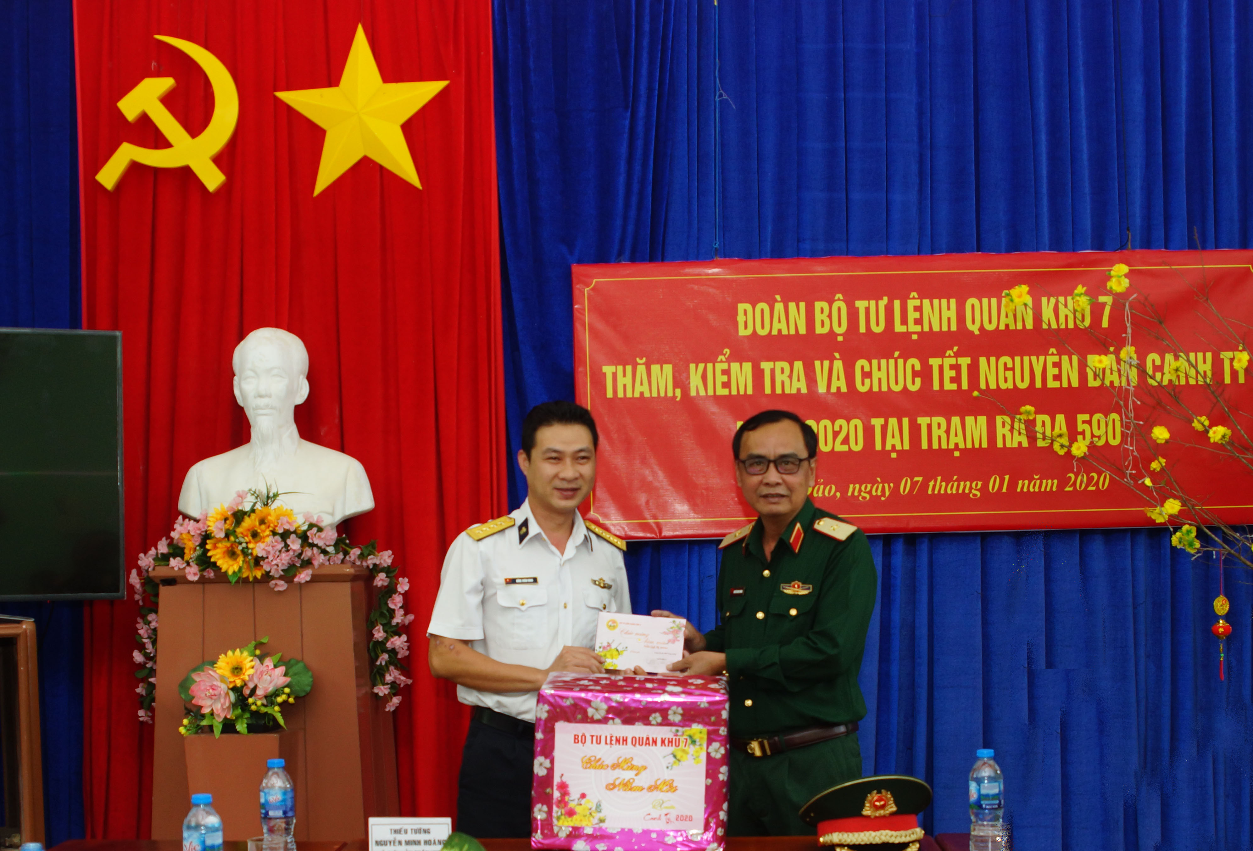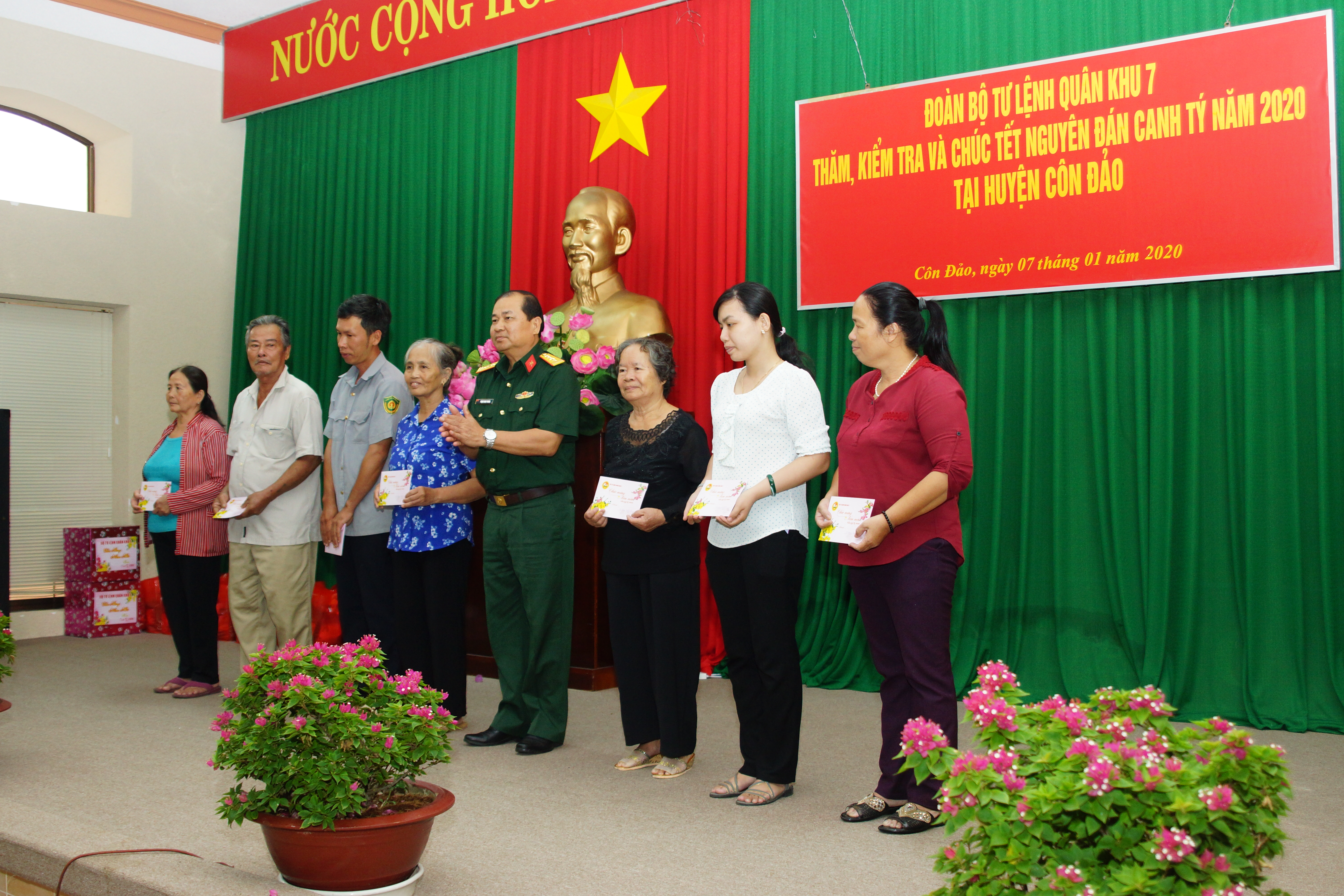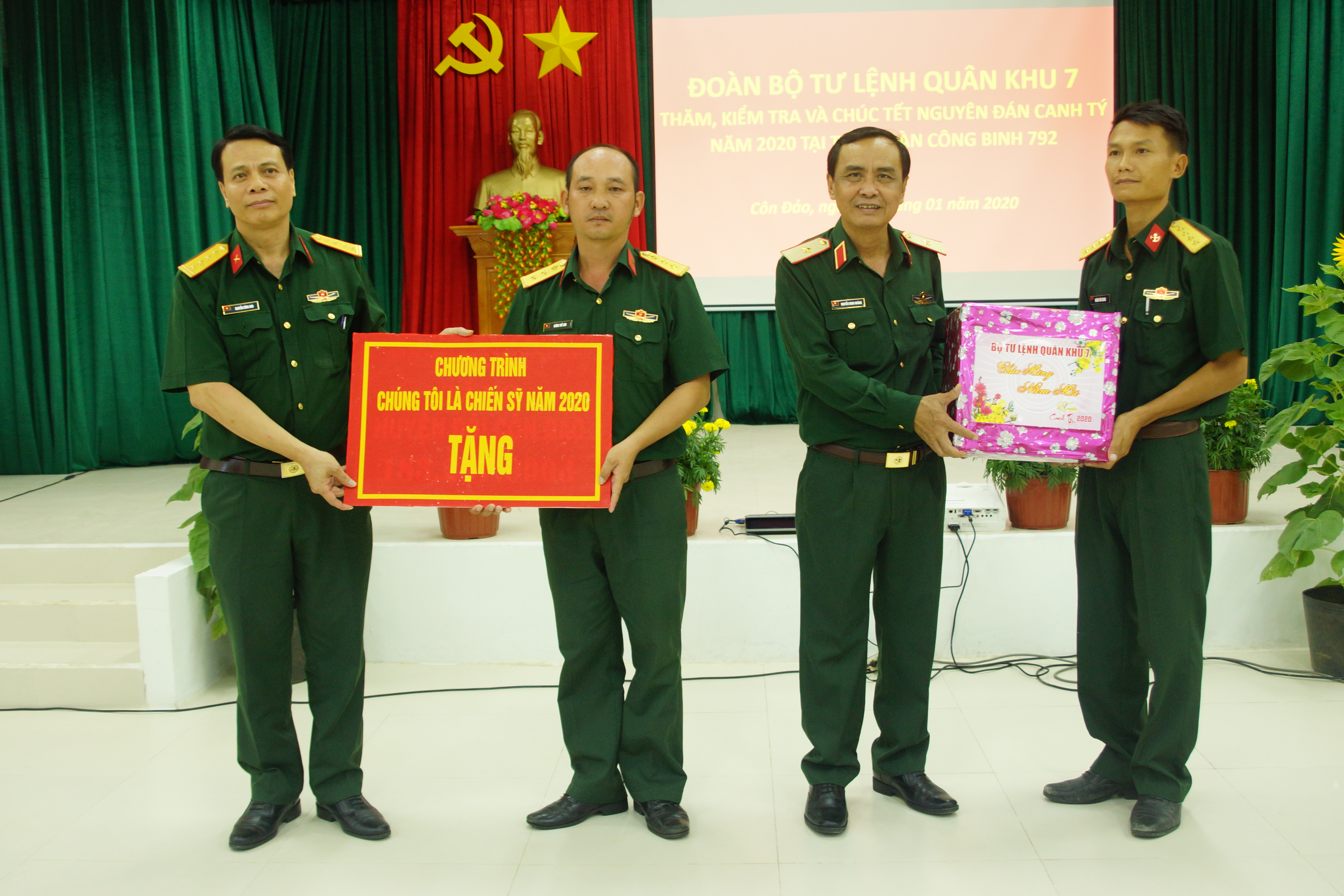 Nhân dịp chuẩn bị bước sang năm mới Canh Tý 2020, Thiếu tướng Nguyễn Minh Hoàng thay mặt Đảng ủy, Bộ Tư lệnh Quân khu tặng quà và gửi lời thăm hỏi, chúc mừng năm mới đến toàn thể cán bộ, chiến sĩ và nhân dân huyện Côn Đảo. Đoàn công tác cũng trao tặng những phần quà cho các gia đình chính sách, gia đình có hoàn cảnh khó khăn trên địa bàn huyện.