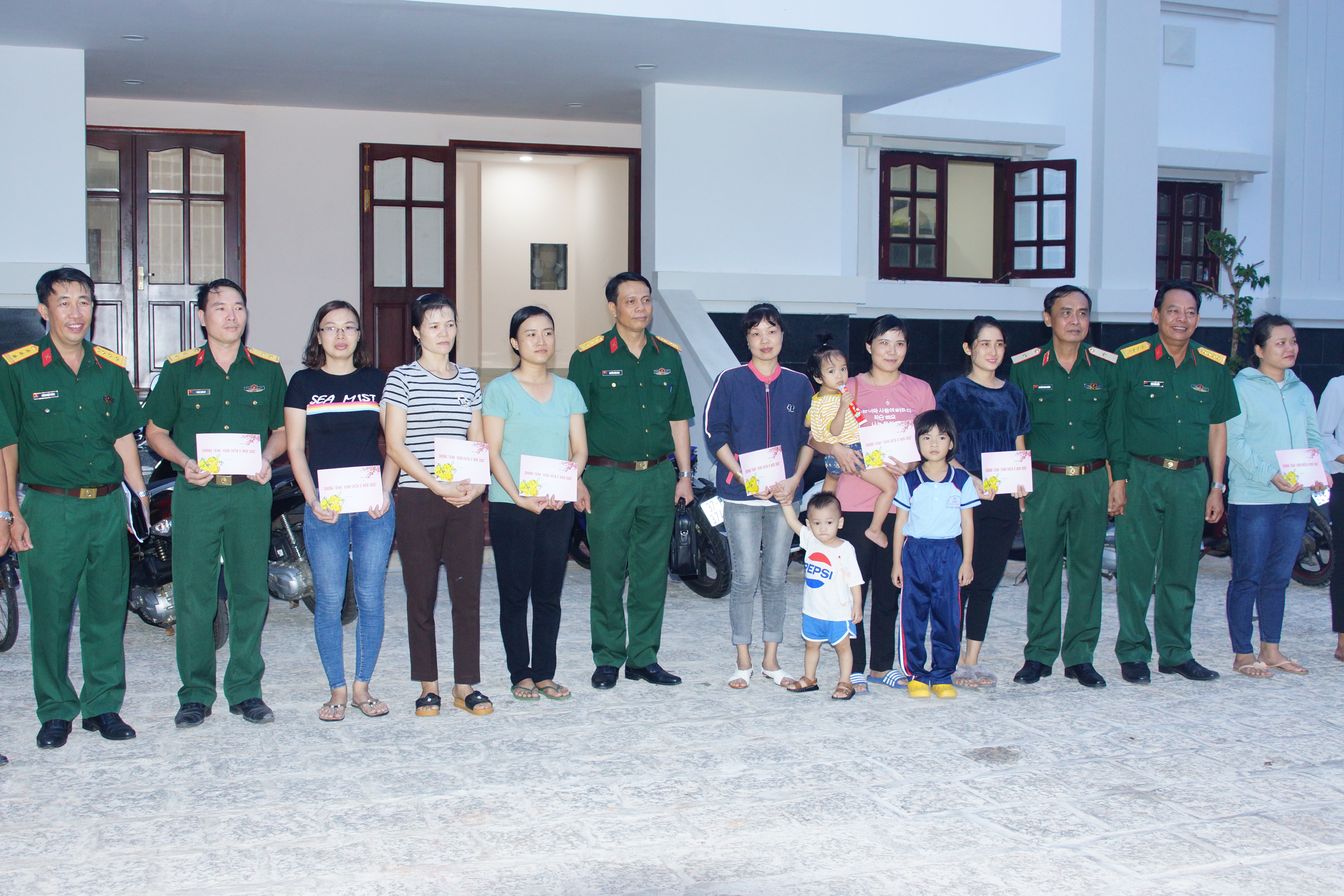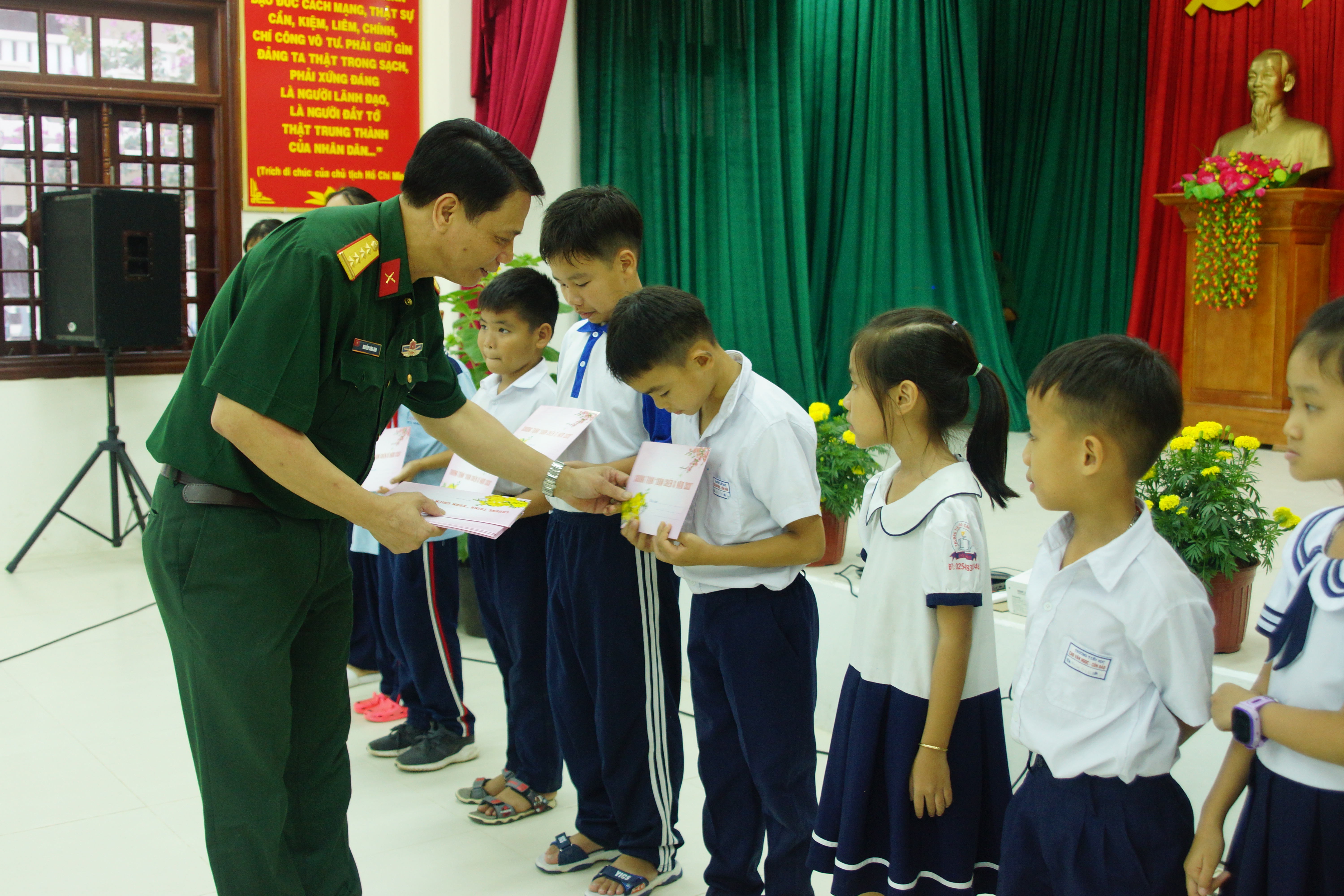 Đại tá Nguyễn Công Anh, Phó Chủ nhiệm Chính trị Quân khu tặng quà cho các cháu là con cán bộ Tiểu đoàn 792