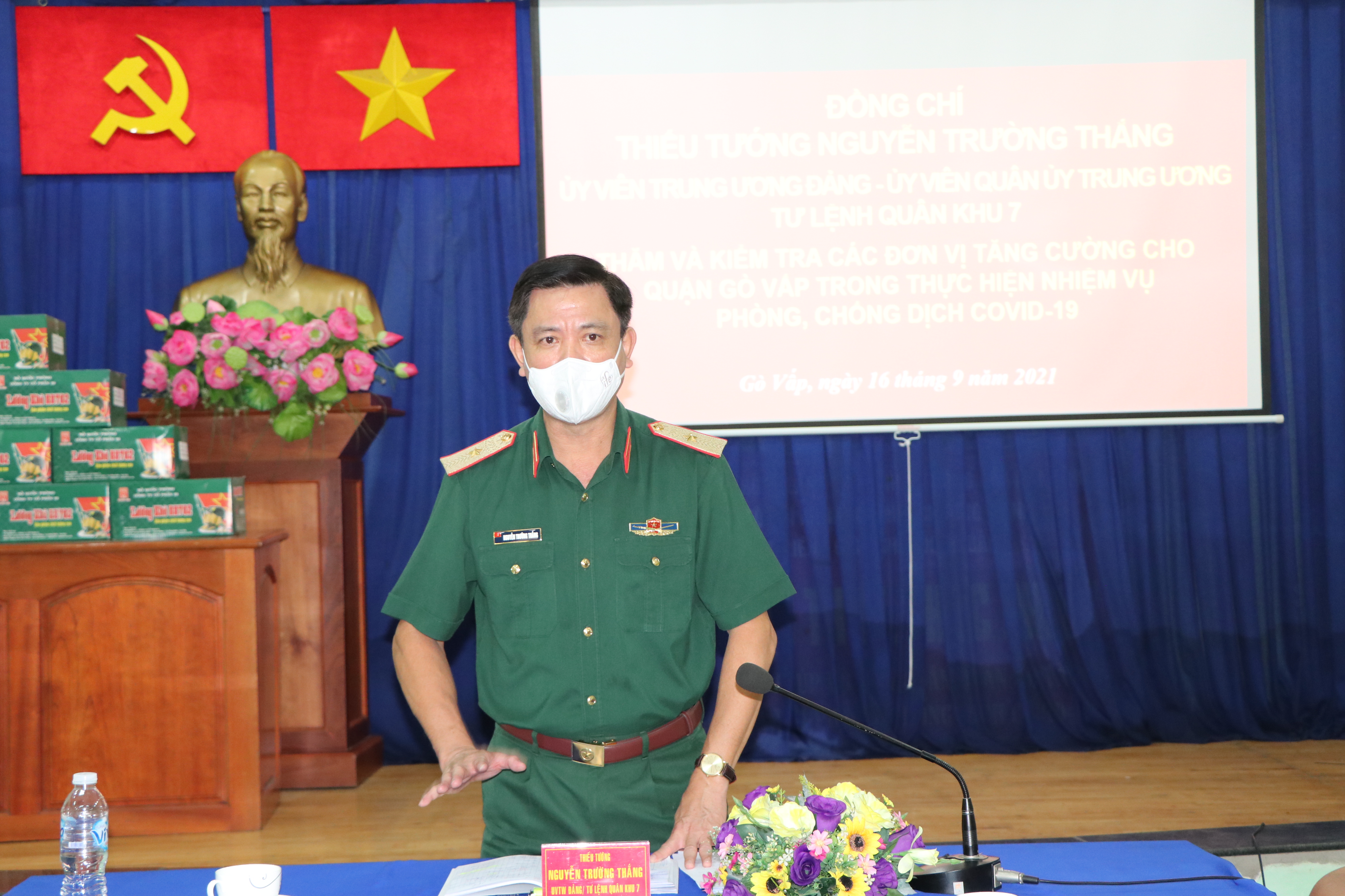 (QK7 Online) - Sáng ngày 16/9, Thiếu tướng Nguyễn Trường Thắng, UVTW Đảng, Tư lệnh Quân khu 7 cùng đoàn công tác Quân khu đến thăm, động viên cán bộ, chiến sĩ Lữ đoàn Phòng không 77, và Lữ đoàn Pháo binh 75 đang tham gia hỗ trợ phòng chống dịch trên địa bàn quận Gò Vấp, TPHCM.