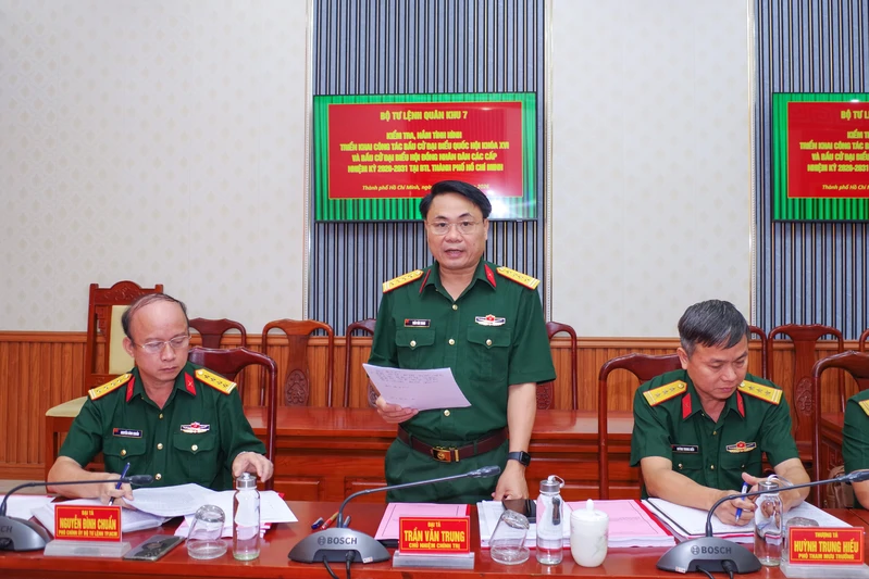Đại tá Trần Văn Trung, Chủ nhiệm Chính trị Bộ Tư lệnh TP. Hồ Chí Minh báo cáo với đoàn công tác về kết quả triển khai, thực hiện công tác bầu cử ĐBQH khóa XVI và bầu cử ĐB HĐND các cấp nhiệm kỳ 2026-2031.