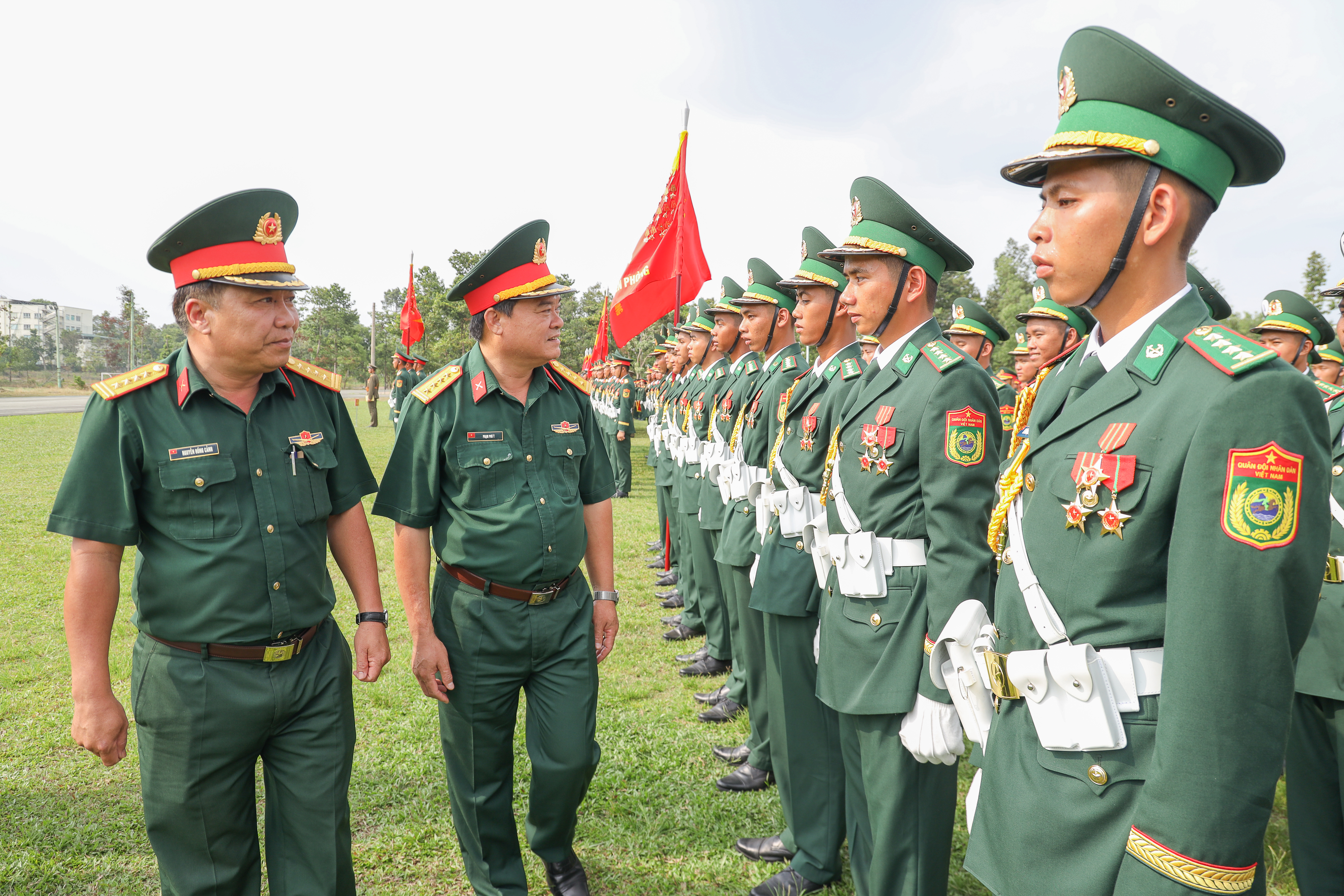 Đại tá Phạm Phú Ý, Phó Tham mưu trưởng Quân khu; Đại tá Nguyễn Hồng Cảnh, Phó Chủ nhiệm Chính trị Quân khu động viên cán bộ, chiến sĩ các khối. Ảnh Lê Tiến.
