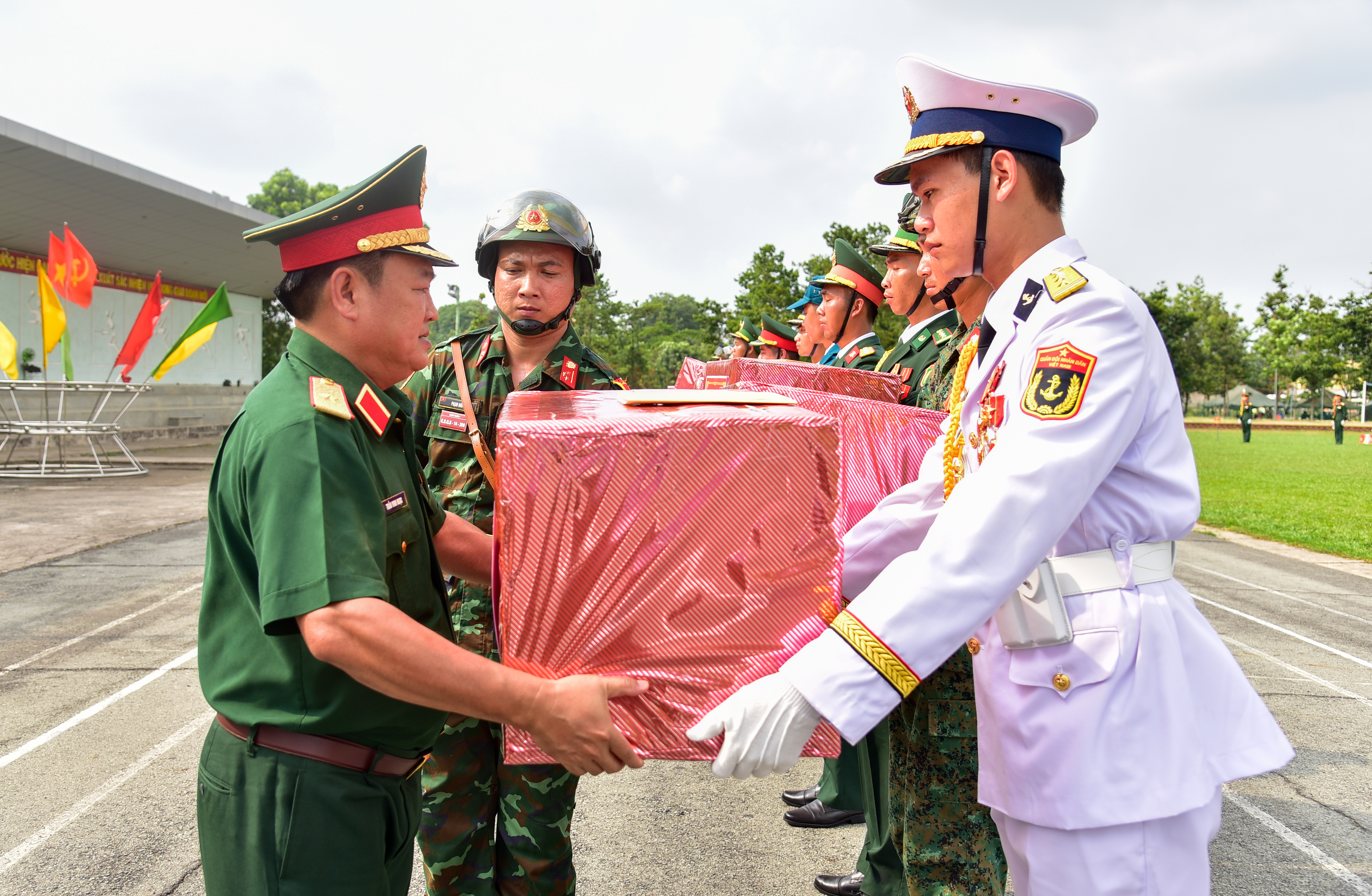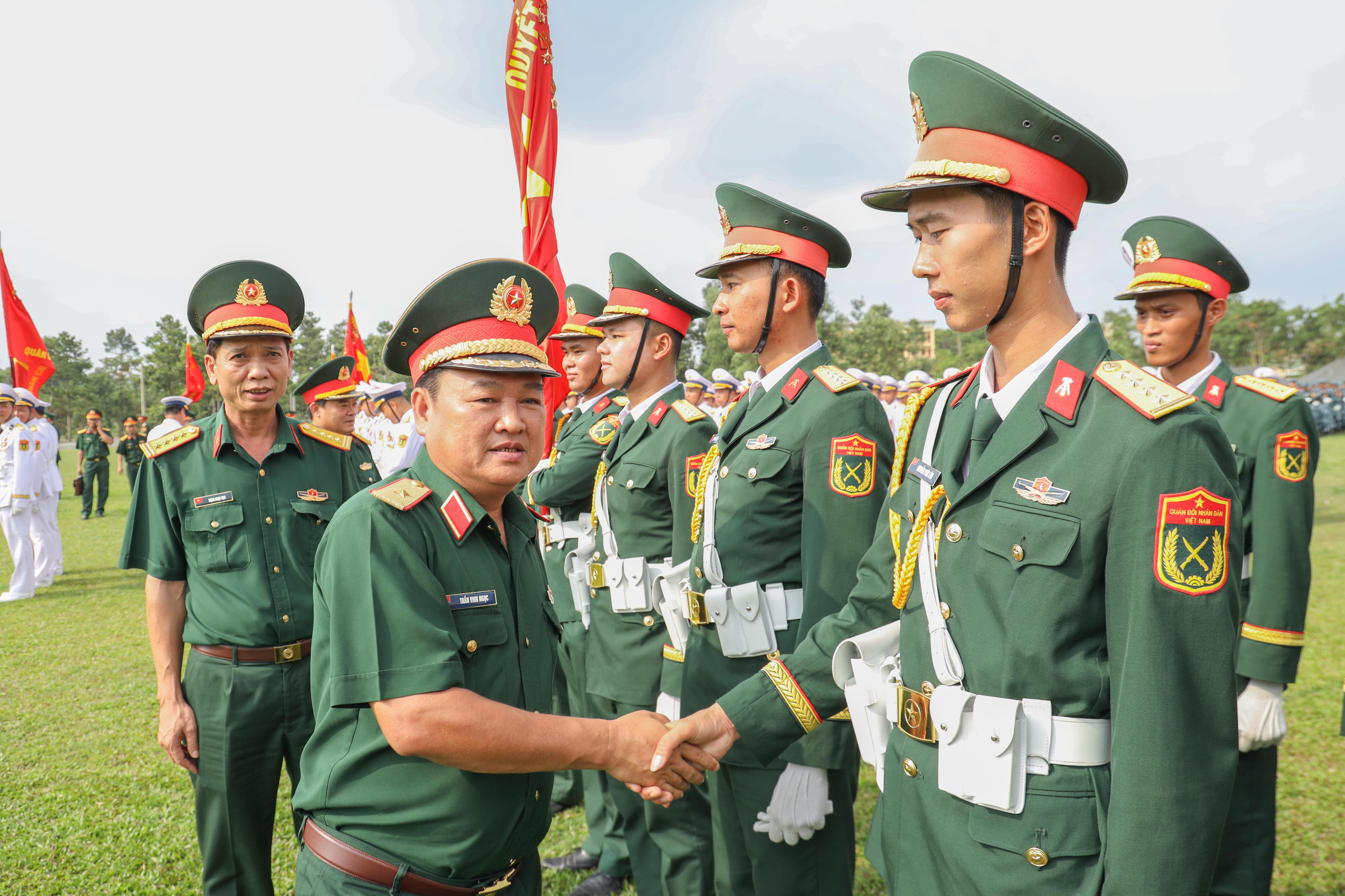 Thiếu tướng Trần Vinh Ngọc, Bí thư Đảng ủy, Chính ủy Quân khu 7 tặng quà các khối luyện tập tham gia diễu binh, diễu hành. Ảnh Lê Tiến.