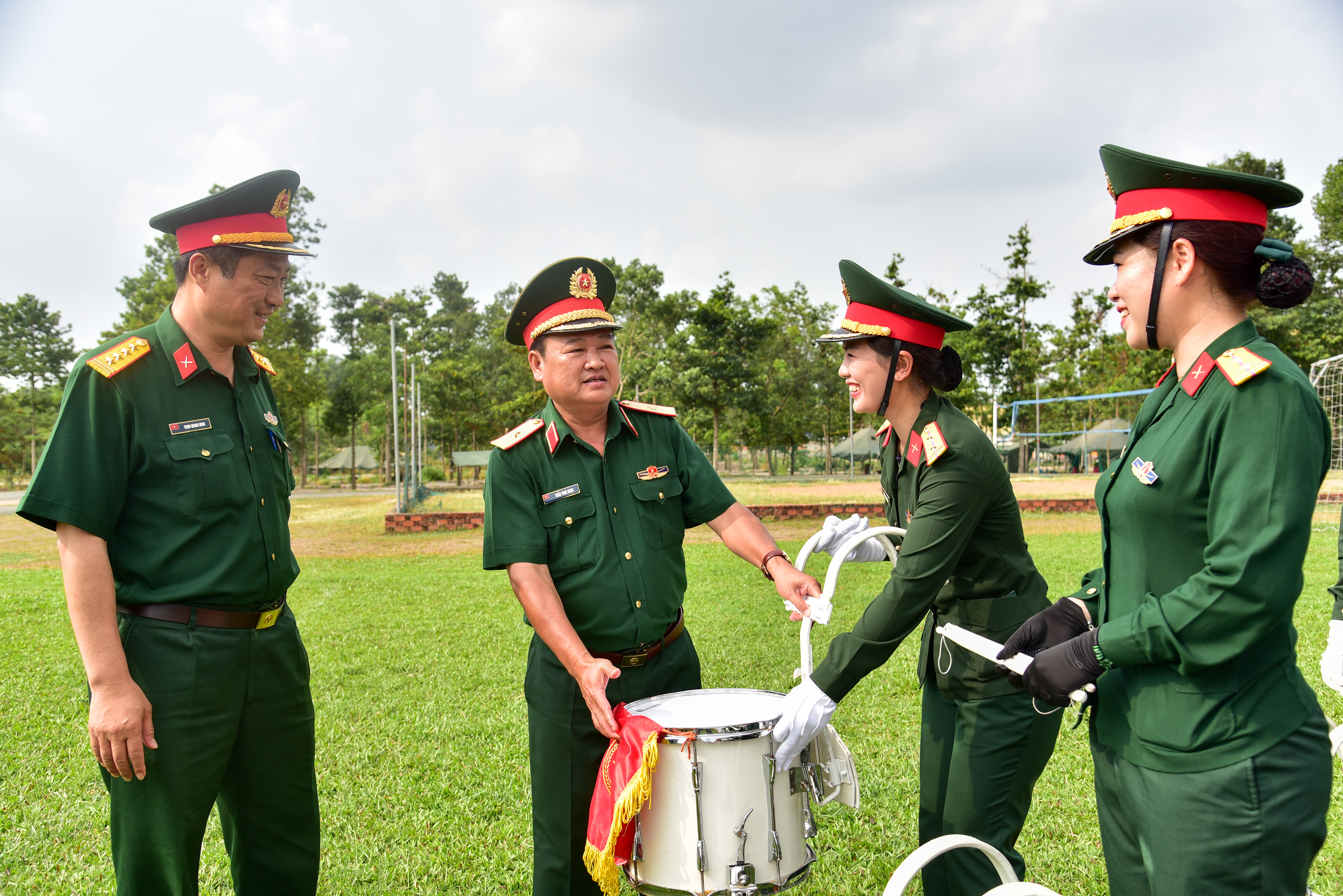 Thiếu tướng Trần Vinh Ngọc, Bí thư Đảng ủy, Chính ủy Quân khu 7 trò chuyện cùng các nữ quân nhân.