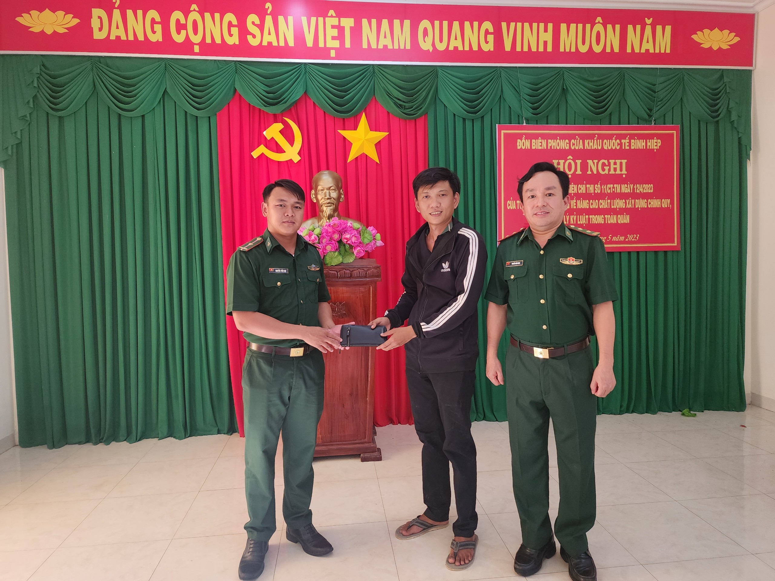 Chỉ huy Đồn Biên phòng CKQT Bình Hiệp và Thiếu úy QNCN Nguyễn Tiến Đạt trao trả lại tài sản cho anh Trần Huỳnh Thanh Duy.